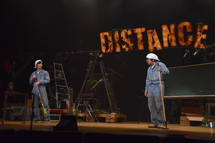 「DISTANCE」という文字が浮かび上がって見える舞台上。企画者・総合監修を務めた川尻恵太と永島敬三が出てくる。二人は、荒廃した劇場の清掃員として登場し、企画のストーリーテラーの役割を担う。「演劇」というものに触れたことはないが、「演劇を復活させるために劇場を掃除してほしい」という依頼をうけてきたという2人の清掃員。かつて演劇が行われていた場所で、演劇に思いを馳せる。それに呼応するかのように、劇場の記憶が呼び起こされていく……。