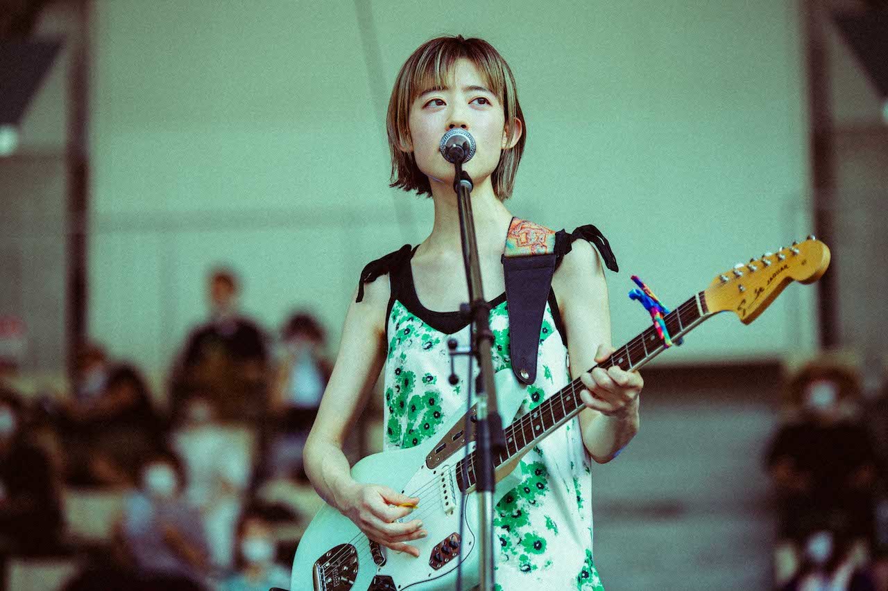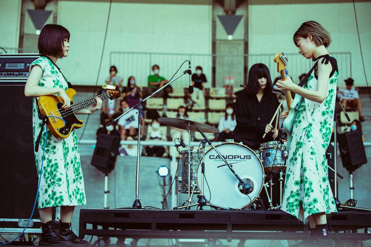 塩塚モエカ(Vo.Gt)とゆりか(Ba)はグリーンの花模様がチャーミングな揃いのワンピース、フクダヒロア(Dr)はストイックな黒一色の衣装で現れ、目にも麗しい存在感だ。ド頭「サイレン」から体感温度を下げるような清涼感を届けてくれる彼女たち。スリリングなドラミングと扉を開け放つような爽快さが共存する「絵日記」では、切々と言葉をつないでいく塩塚の歌声が何とも胸に迫る。凛とした印象が際立つスローな「ソーダ水」と、緩急自在なセットにすっかり目も耳も釘付けになる他ない。