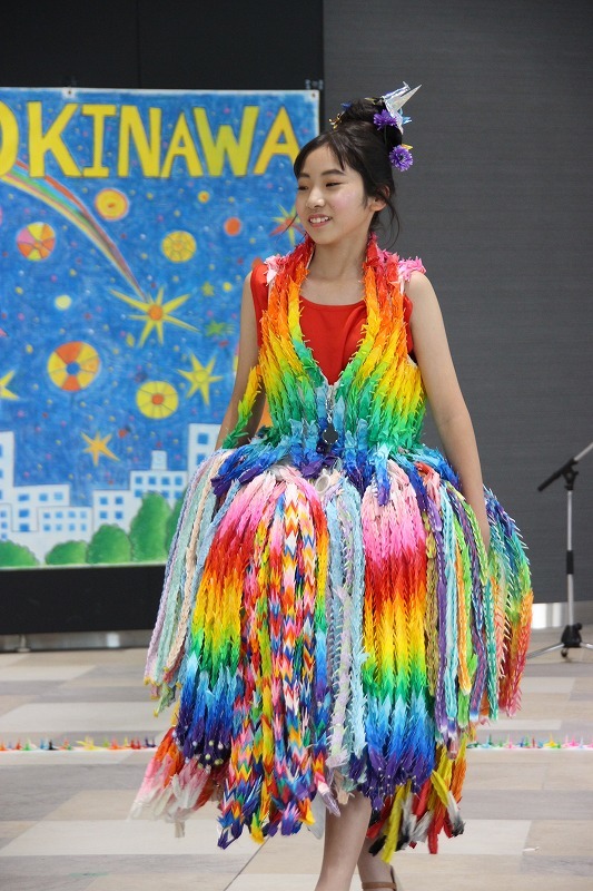 ショーの終盤には、広島市と同じく原爆の被害を受けた長崎市、沖縄戦で大きな痛みを受けた沖縄市の3市をつなごうと、それぞれの市から折り鶴を集めた豪華なドレスもお披露目された。