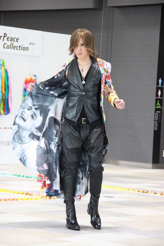 20年ほど前から難民問題に関心を持ち、UNHCR(国連難民高等弁務官事務所)のスタッフとの出会いをきっかけに、2016年にはヨルダンの難民キャンプを訪問するなど、啓発活動に取り組んでいるSUGIZOは、イラクの小児がん医療支援などを行う団体『JIM-NET(日本イラク医療支援ネットワーク)』の子どもたちが描いたイラストで構成されたロングジャケットを身にまとってランウエイへ。