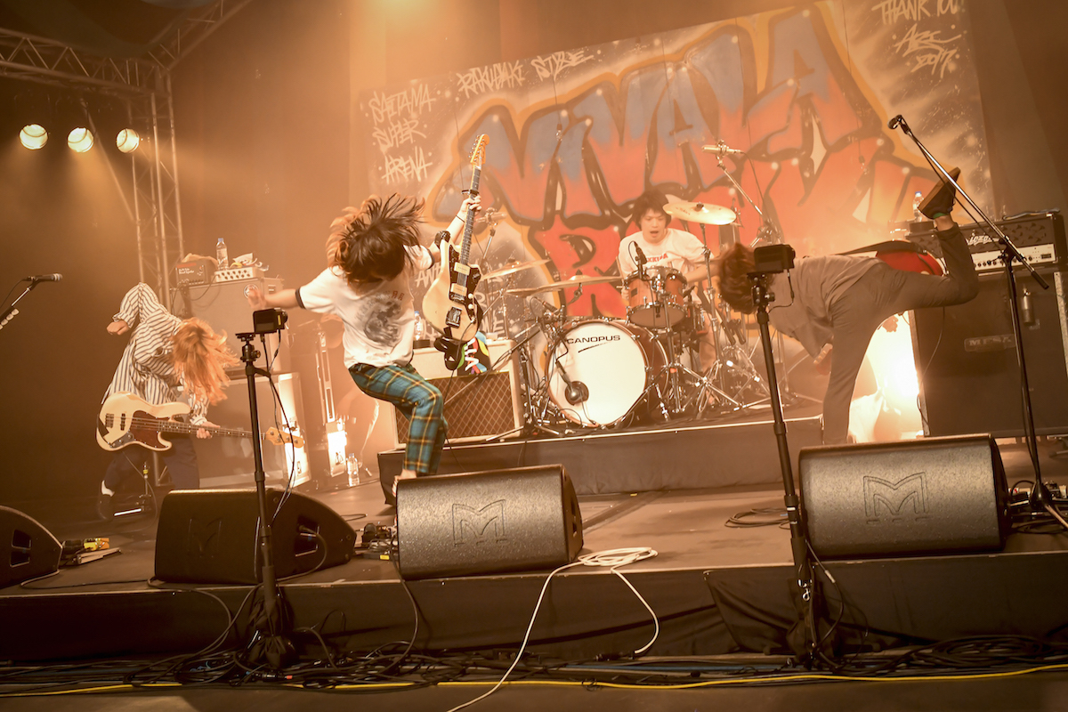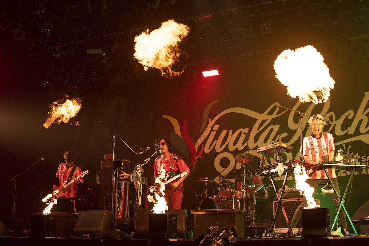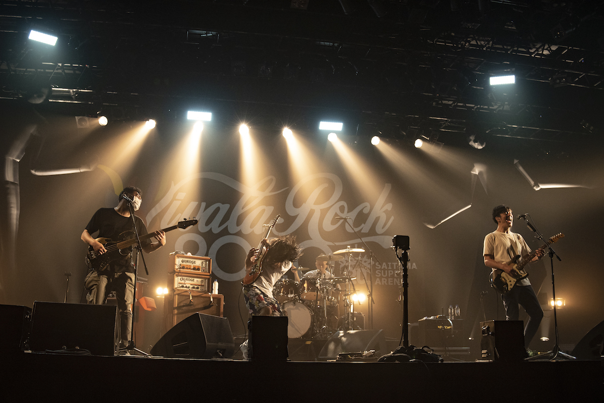 平日開催のため夕方からのスタートだったこの日、VIVA! STAGEのラストを飾ったのはネクライトーキー。ファンキーな曲かと思いきやミュージカル調になったり、かと思えば複雑なキメを用いた間奏が炸裂したりと、このバンドのヤバさを1曲に凝縮した「ぽんぽこ節」でライブを始める。一筋縄どころか、二筋縄でも三筋縄でもいかなさそうなプログレポップを鳴らす剥き出しのバンドサウンド。アイコニックな歌声を持ち主・もっさ(Vo/Gt)はメンバーのソロ前に「ギター!」と叫ぶ声含め、演奏中はとにかくカッコいいのに、MCになると小声になりフェードアウト気味になるというギャップ。加速に加速を重ねて終わるラストまで非常にスリリングだった。