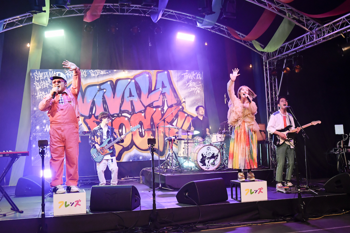 「やっぱずっと楽しいね、ライブって!」(えみそん/Vo)、(ステージ衣装に)着替えてるだけでちょっと楽しかったもん」(ひろせひろせ/Vo/Key)というやりとりもあったように、フレンズは5ヶ月ぶりのライブだったそう。歌詞をところどころビバラに因んだワードに替えたボーカル陣をはじめ、メンバーみんな幸せそうに演奏しているのが画面越しでも伝わってきた。初日のKEYTALKなど、他のバンドを観たときにも思ったが、『ビバラ!オンライン 2020』は“ライブのできる場をアーティストに提供する”という役割も担っていて、その役割は観客の私たちが想像する以上に大きいようだ。演奏終了後には、画面がなかなか切り替わらず、「終わって~!」と言いながらカメラに手を振り続けるハプニングも。