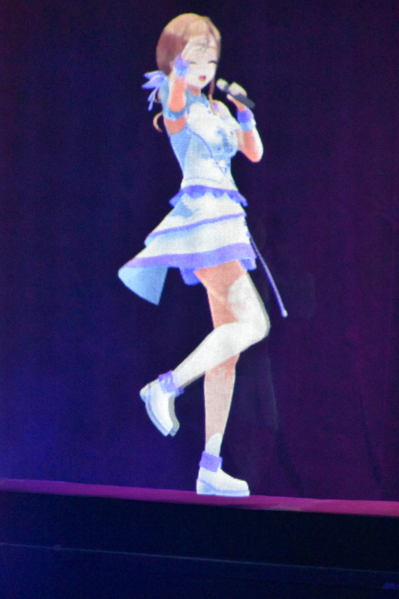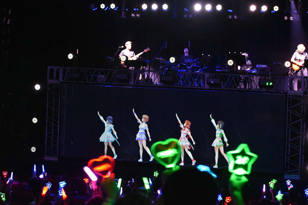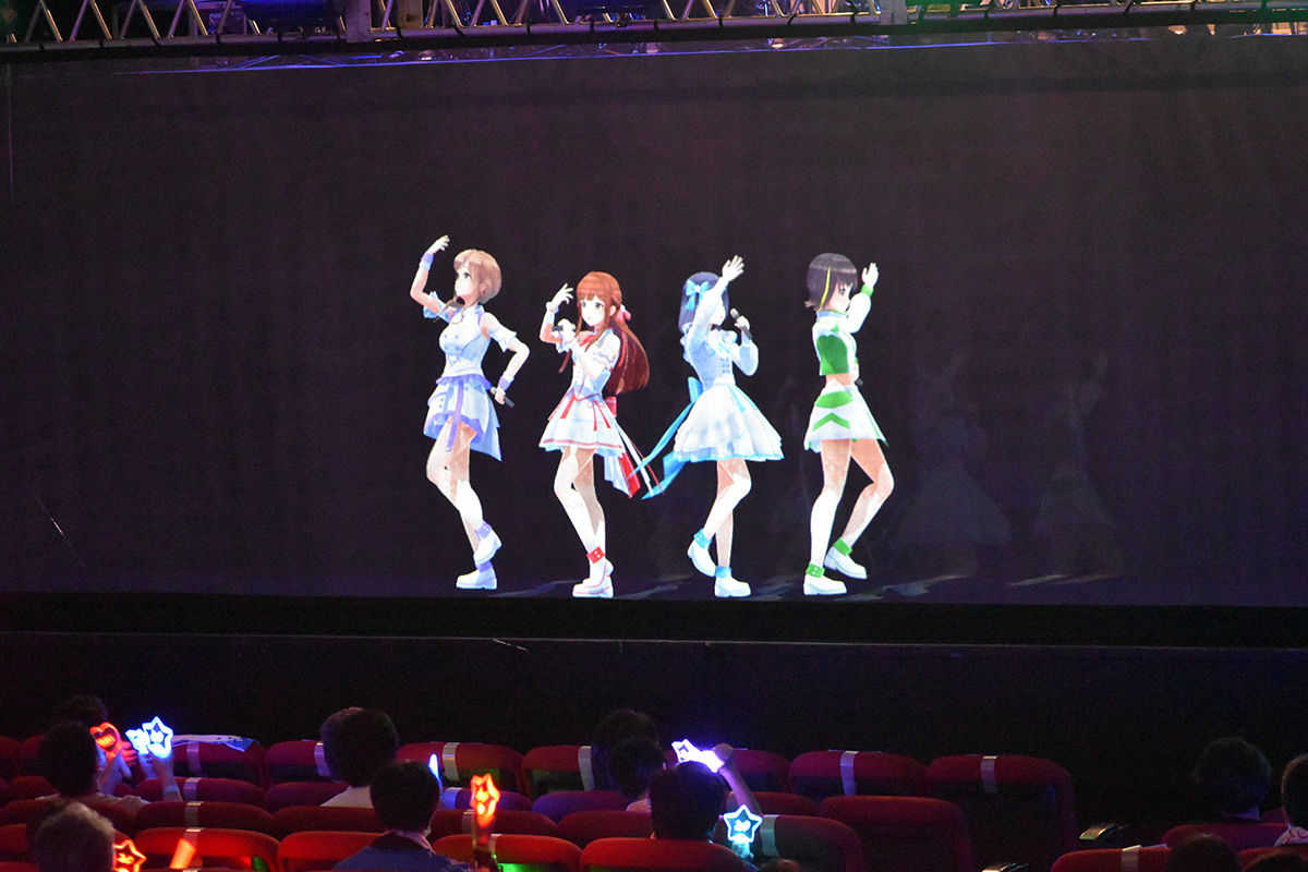 写真ではわかりづらいかもしれないが、VRゴーグルなどの機器越しではなくてもステージ上には4人の姿がはっきりとした立体感と共にリアルに存在して唄い踊っているのだ。その歌やダンスも3Dキャラクターを使ったリズムゲーム的なものとはまったく違う、ライブならではの生の躍動感にあふれていた。