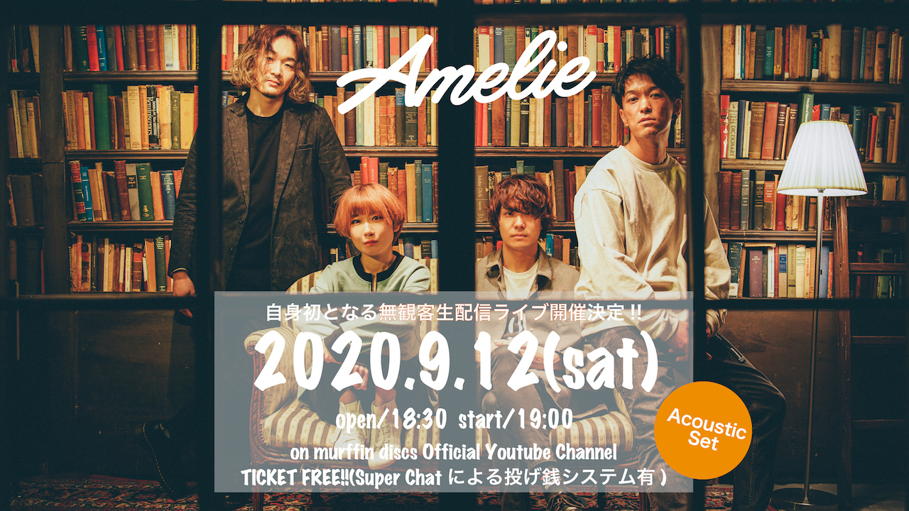 Amelieが9月12日(土)に、自身初となる無観客での生配信ライブの開催を発表した。今回の配信は、アコースティック編成でのライブとなり、Amelieが所属するmurffin discsのOfficial YouTubeチャンネルにて無料で生配信され、Super Chat機能を利用した投げ銭形式のシステムも同時に実施される。