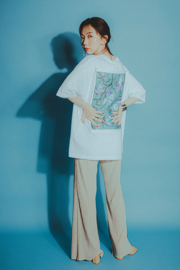 ラインナップはTシャツ2種、スカーフ、ポーチ、香水。Tシャツはオーバーサイズで着こなせるトレンドのビックシルエットで、バックデザインはLee Izumida書き下ろしの作品が配されたテキスタイルをカットオフで全面に縫い付けられている。香水は向井が自ら調香したもので、トップノートはライムなどの柑橘の香りにベルガモットのビターさが大人の爽やかさを感じさせるポップな香りで、ミドルノートのウッディやフルーティフローラルの繊細な香りが奥に潜み、ベースノートの構成が深く落ち着いたイメージをもたらすフローラルオリエンタルアンバーの香りになっているとのこと。グッズの販売に合わせて、向井がモデルとして着用しているルック写真も公開されている。