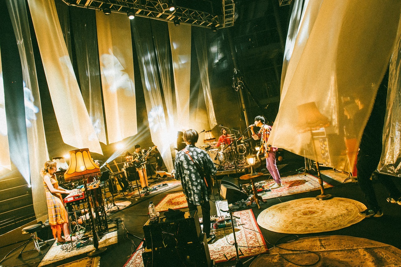 周りに緑の木々が見える会場には、セット上方から吊るされた細長い透明のビニールと紗幕がゆっくりと風に揺れ、メンバーの周りには様々な種類のランプが置かれている。さらには、スモークも焚かれていて、何とも幻想的な雰囲気の中、「はにかんでしまった夏」や「見せかけのラブソング」といった楽曲が演奏されていく。