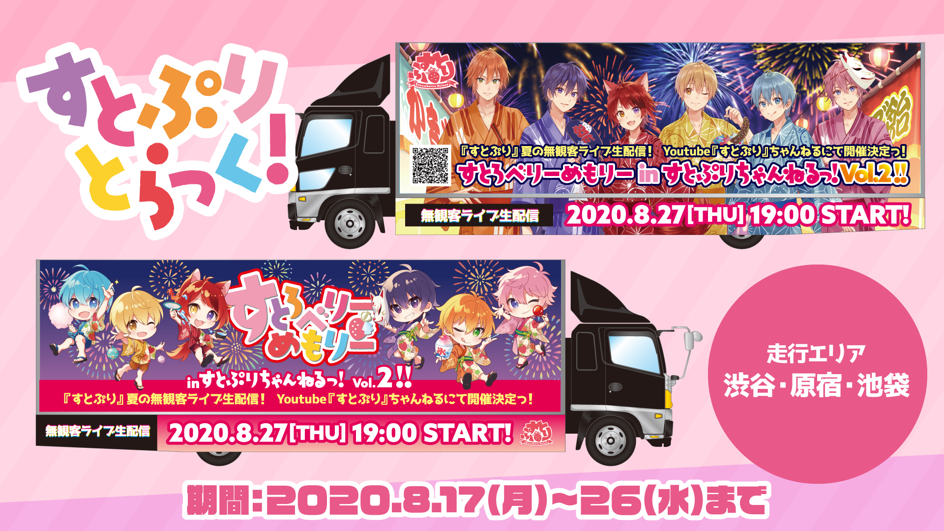 すとぷりの生配信無観客ライブ『すとろべりーめもりー in すとぷりちゃんねる vol.2!!』をお知らせする「すとぷりとらっく!」が2020年8月17日(月)から26日(水)までの期間走行する。