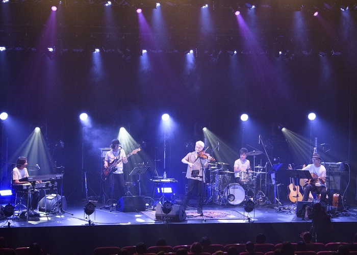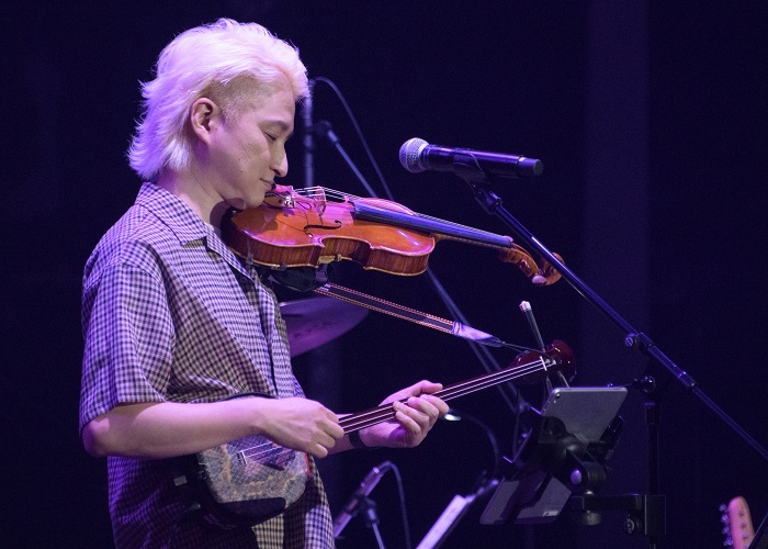 ここで換気タイムが設けられ、スタッフが客席の扉を開いた。ヒューリックホール東京の高機能な設備により公演中も基準以上の換気が施されていたが、視覚的にも安心してもらいたいというNAOTOの粋な計らいによるものだ。そして、松本が「ハッピー・バースデー・トゥ・ユー」の旋律をさらりと弾くと、ステージ上に大きなバースデーケーキのオブジェとリモコン式のキャンドルが登場し、祝福の空気に包まれた。沖縄の三線、中国の楽器である二胡、そして、ヴァイオリンを持ち替え演奏した「GE・I・SHA」では、三刀流というNAOTOの新たな一面も披露。そしてライヴ終盤には、NAOTOの代表曲の数々がエンジン全開のプレイで届けられた。