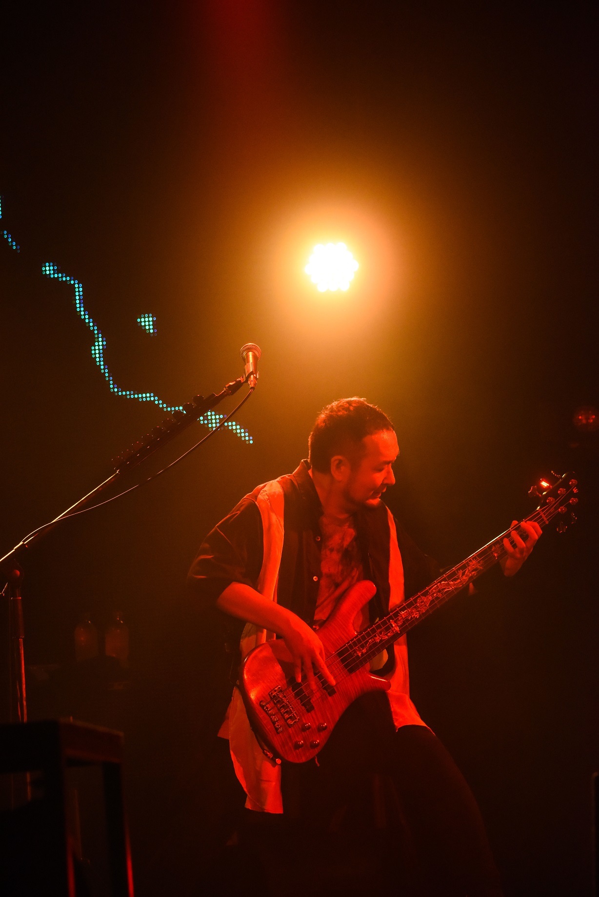 ドライブ感ある「INNOSENSE」、楽器隊が白熱の演奏で魅せたインスト曲「INVASION」、<この声が聴こえていますか?>と画面の前の一人ひとりに向けて歌を届けた「CALLING」と、ライブバンドの凄みや風格を感じさせる歌と演奏が続き、MCではTwitterで「#FLOWアニメ縛りオンライン」宛に届いたメッセージを読み上げ、配信ならではの視聴者とのコミュニケーションを楽しむ。「感謝の気持ちを伝えられるのはライブだけ。みんなでライブを作って行きましょう!」とメッセージを伝え、前向きな気持ちを届けた「光追いかけて」、「COLORS」を披露すると、先の見えない未来に希望の光が射し込む。