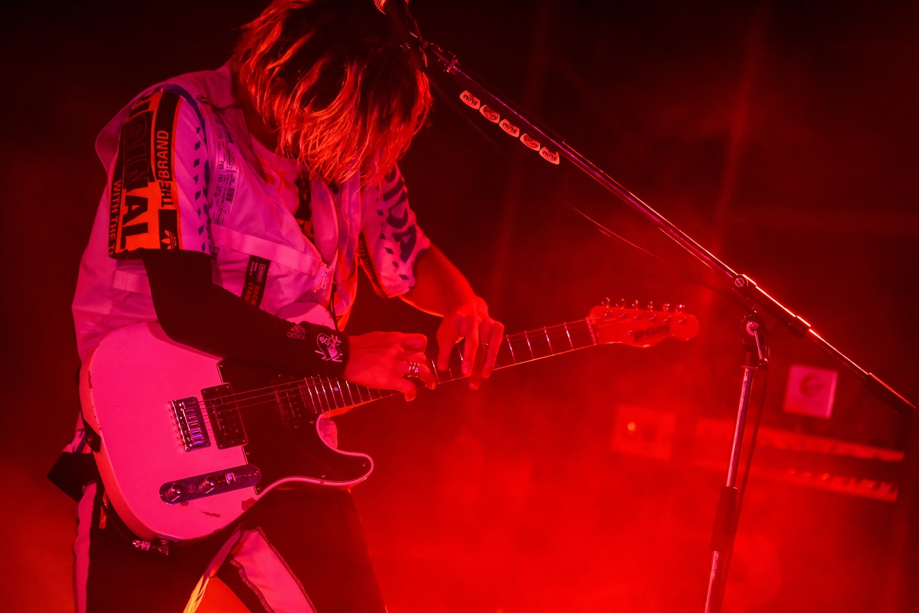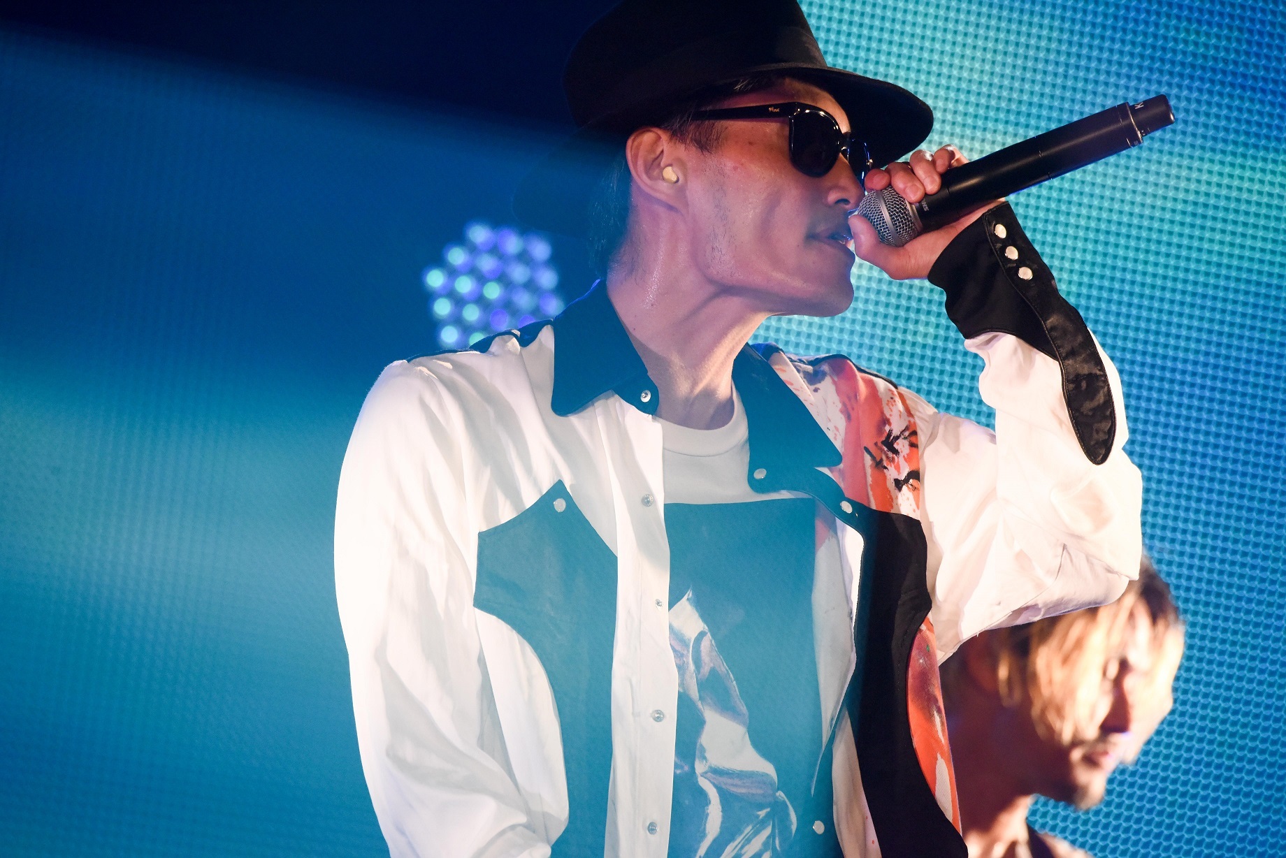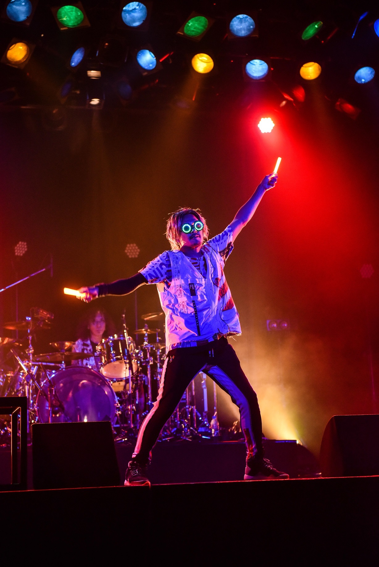 GOT'S、IWASAKIがソロプレイで魅せたメンバー紹介では、光るサングラスをかけたTAKEが登場。「FROGS ~ケロンパ帝国の逆襲~」に乗せてサイリウムを振りながら踊りだすと“影分身”で3人に分身! 気持ちよさそうに踊り終え、「自粛中に影分身を習得しました」と笑うと、「次はお前らの番だ!」とカメラに指さし、リズム隊のビートに乗せたエクササイズタイムに突入!! 画面の前の視聴者も準備体操をしっかり済ませたであろうところで始まった「愛愛愛に撃たれてバイバイバイ」では、画面の4隅に現れたヲタ芸ダンサーが振り付けを煽ってアゲまくり、ライブはクライマックスへと向かっていく。