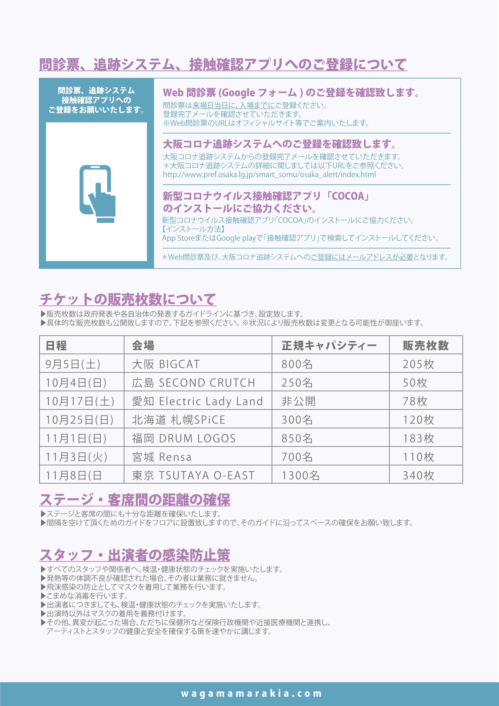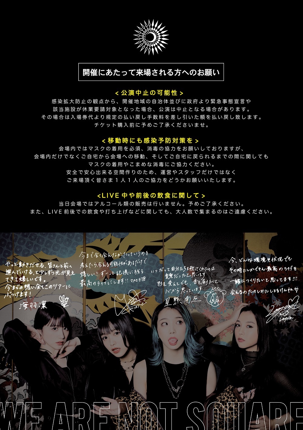 これは、まだ制限は多い中ではあるが、LIVEを生で届けたいというメンバーの想いを体現した形で、同時に発表されているガイドラインからも見て取れるように、感染予防対策を万全に行った上での有観客での開催となっている。