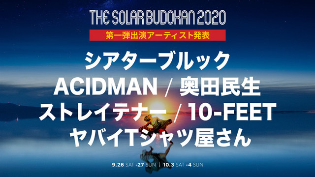 顔ぶれは、シアターブルック、ACIDMAN、奥田民生、10-FEET、ストレイテナー、ヤバイTシャツ屋さんの6組。そのうち、9月13日(日)に東京(中野サンプラザ)で観客を入れた事前収録として開催されるリアルライブイベント『THE SOLAR BUDOKAN IN SUNPLAZA』には、奥田民生とストレイテナーが出演する。なお、この事前収録に出演するアーティストは今後も発表される予定となっている。