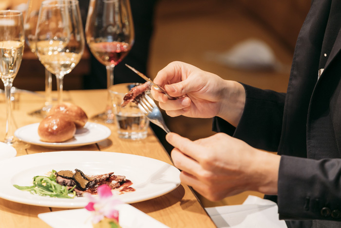 福田料理長渾身の鴨肉を口に運ぶと「これは、シャンパンが進みますね」と笑顔に。自宅では、ワインを飲むことを想定した料理を作ることもあると言い、「牛肉の塊を買ってきて、赤ワインで煮込みを作ることもあります。ストウブ鍋を持っているので、簡単にできちゃうんですよ」と話すと、女性スタッフから「すごい!」と声があがっていた。