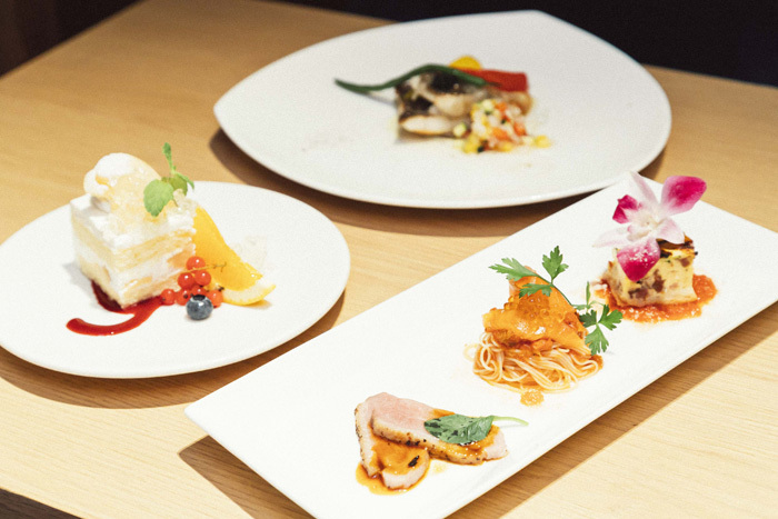 「趣味で料理をする」という大井は、前菜の鴨肉が低温調理されていることを知ると、福田料理長に「どんな調理器なんですか?」と質問攻めに。同じ皿に盛り付けられた「イクラとサーモンの南仏冷製パスタ」は、「自分でも作ってみたい」と料理好きの一面を見せた。
