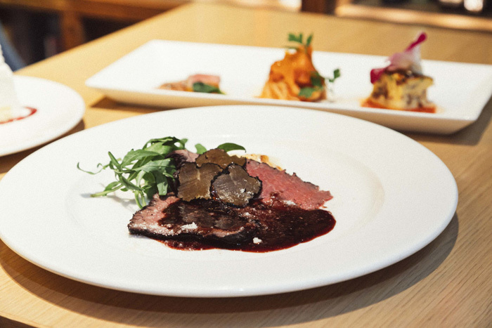 「ことしはサマートリュフの当たり年」と語った福田料理長が、メインの肉料理に用意したのは「牛ももロティ 赤ワインソースサマートリュフ添え」。歌手のエディット・ピアフを讃えた、プーランクの曲に合わせたブルゴーニュのワインは「しっかりと渋みがあって、ソースにもワインを感じる料理にぴったり」と食通の大井をうならせた。