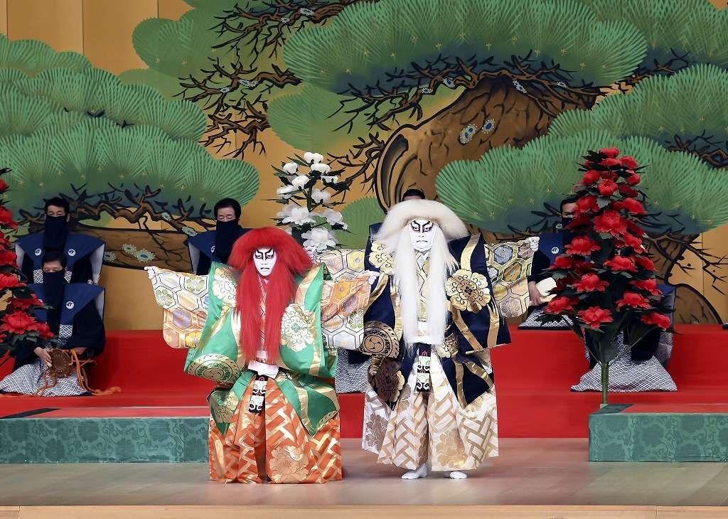 『連獅子』(右より)狂言師右近後に親獅子の精=片岡愛之助、狂言師左近後に仔獅子の精=中村壱太郎 (C)松竹