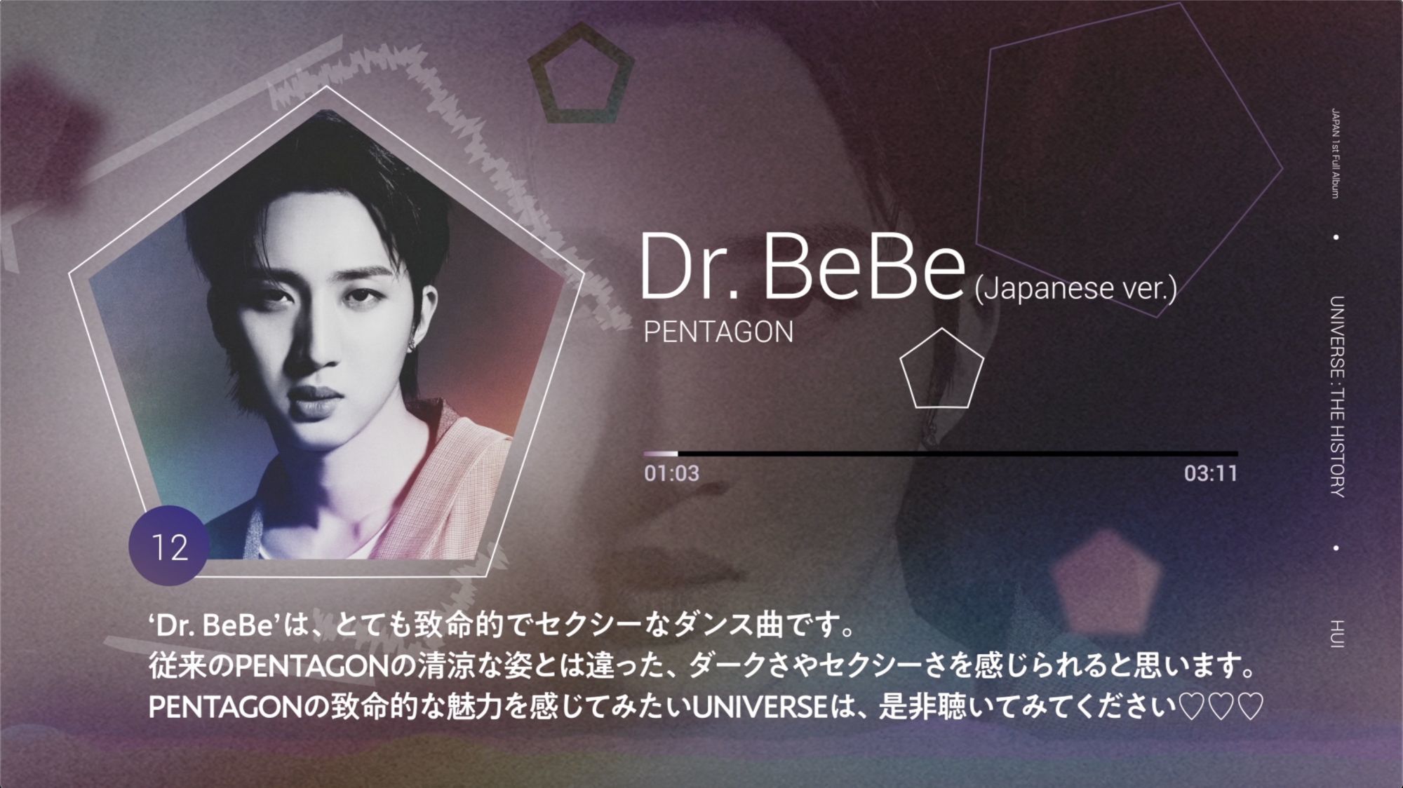 本日公開となった映像は、先日PENTAGONのJAPANオフィシャルTwitterにてデイリーで公開された映像を全てつなぎ合わせたもので、楽曲ごとにメンバーのレコメンドコメントが掲載されている。過去にリリースされた楽曲は今回のリリースにあわせてリマスタリングされており、「To Universe (Japanese ver.)」「Humph! (Japanese ver.)」「Dr. BeBe (Japanese ver.)」はメンバーのジンホ入隊前に、今回のアルバムのためだけに収録している。