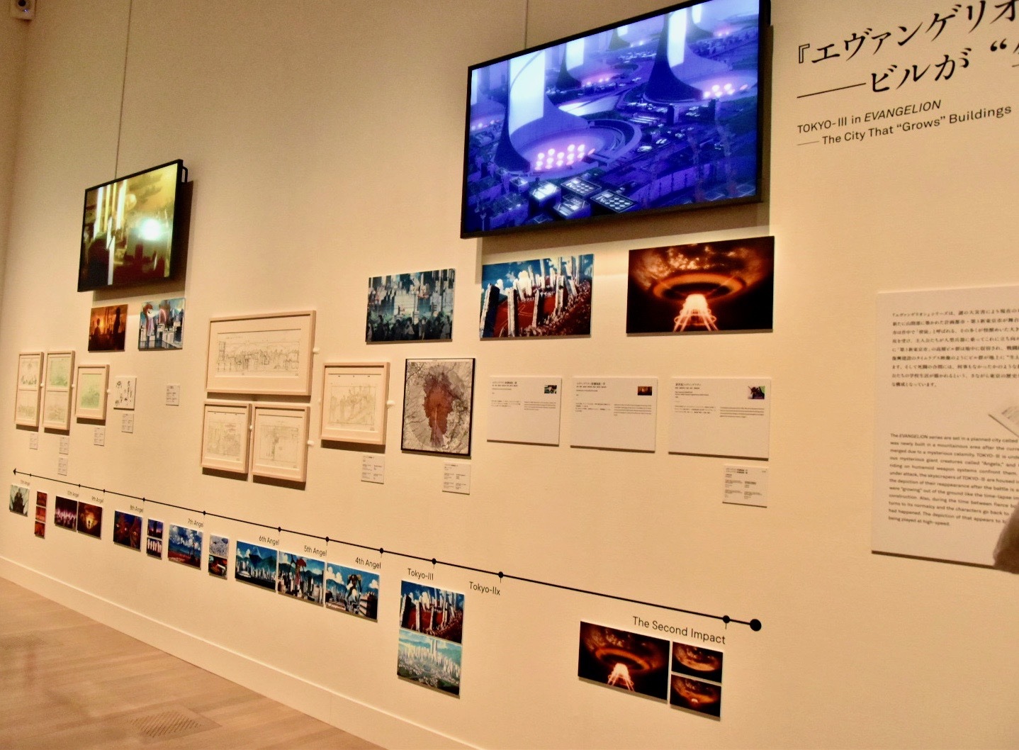 セクション1「破壊と復興の反復」より『エヴァンゲリオン』シリーズ(庵野秀明)の展示風景
