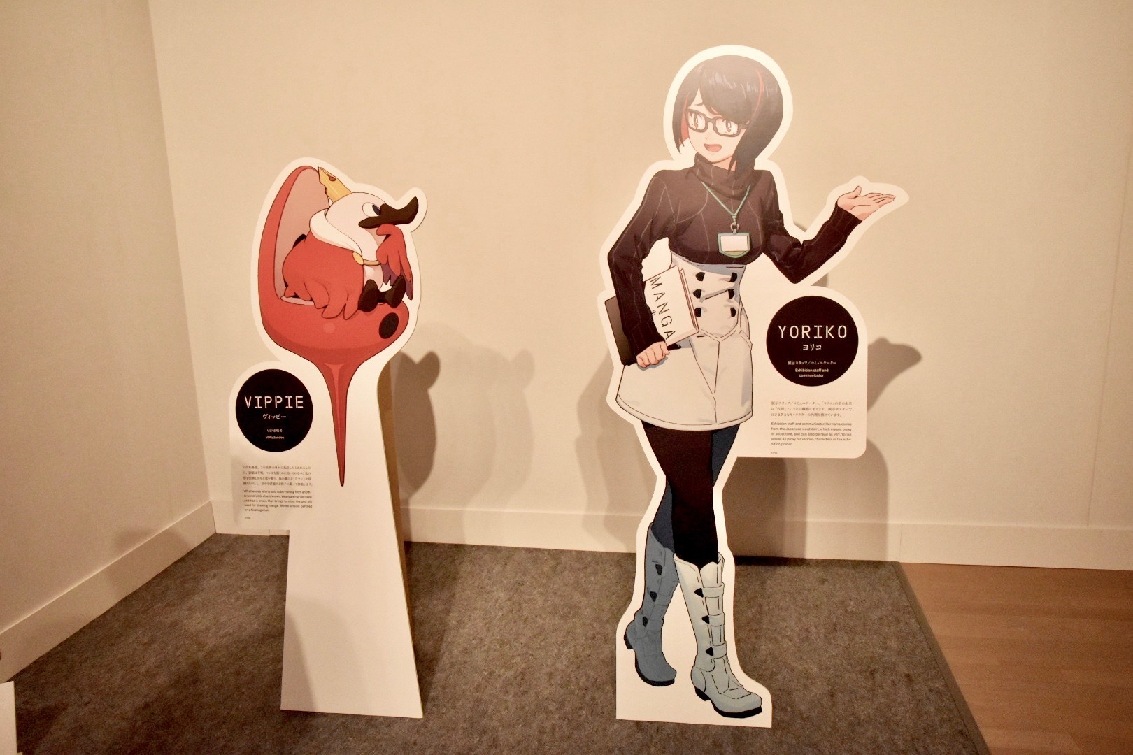 本展オリジナルキャラクターのヨリコ(右)とその相方ヴィッピー(左)。キャラクターデザインを手がけたのは吉成曜(トリガー所属)