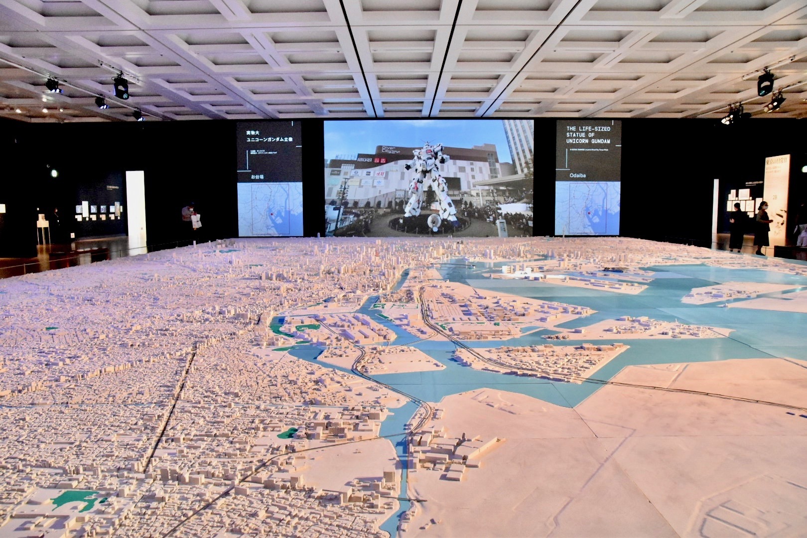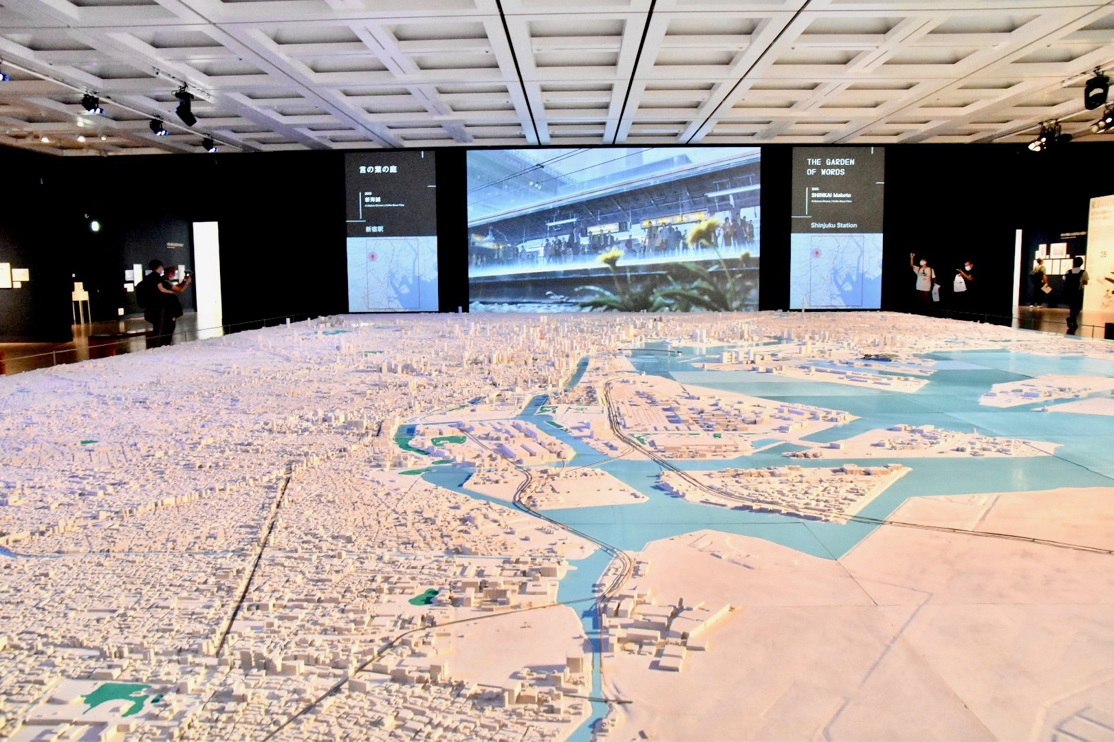 前方の巨大スクリーンには、東京の破壊を描いた『AKIRA』や『ゴジラ』、『シン・ゴジラ』の象徴的なシーンをはじめ、東京の街を美しい映像で描き出した、新海誠監督による『言の葉の庭』や『秒速5センチメートル』、お台場に出現した実物大のユニコーンガンダム立像、都内を疾走する『グランツーリスモ』の画面などが、迫力満点に映し出される。ゴジラが破壊したエリアがライトアップされるなど、スクリーンの映像と都市模型が呼応するような演出にも注目したい。