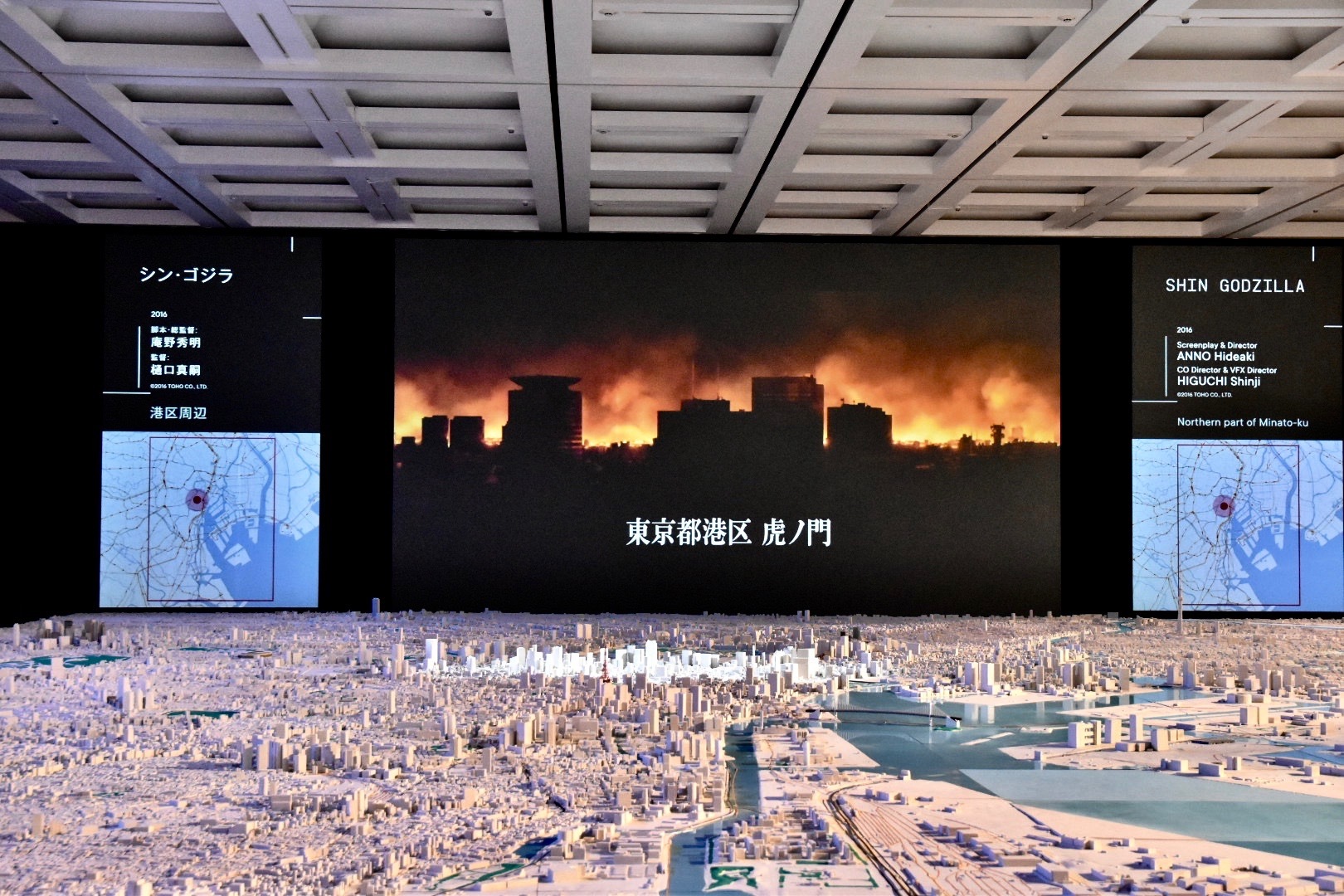 巨大スクリーンの映像に合わせて、ゴジラの破壊したエリアが明るく照らされている