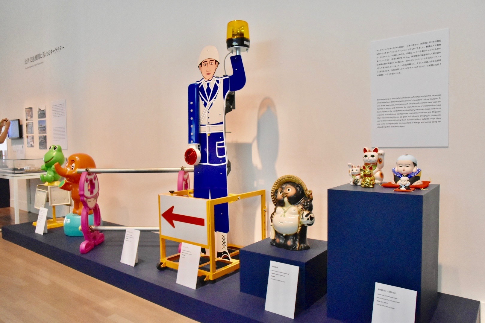 最後のセクション「キャラクターvs.都市」では、現実の都市空間に現れたキャラクターたちを取り上げる。人型の誘導用看板から製薬会社のマスコットキャラクター、招き猫や信楽焼の狸など、マンガ・アニメのキャラクターより以前から、国内ではさまざまなキャラクターを街中で見かけることができた。