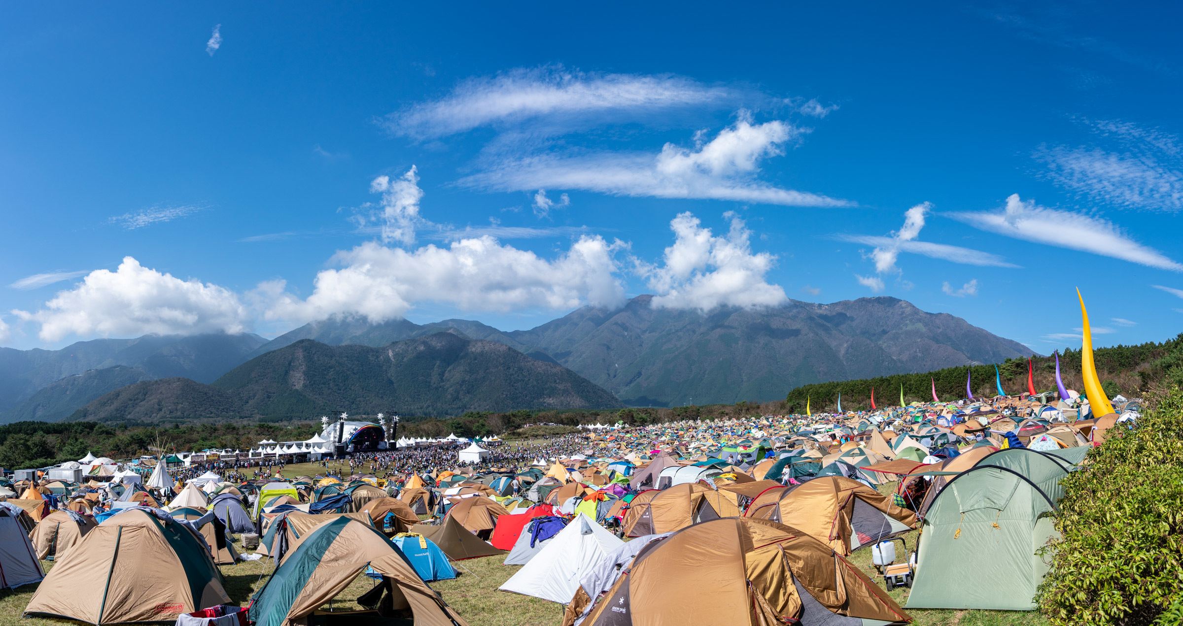 『朝霧JAM』の最大の特徴は、なんと言ってもキャンプをしながらライブを楽しめるオール・キャンプ・イン・フェスであること! 会場は富士山麓に広がる緑豊かな朝霧高原にある朝霧アリーナとふもとっぱら。知る人ぞ知るキャンプの聖地では犬も一緒にキャンプを楽しむことができます。