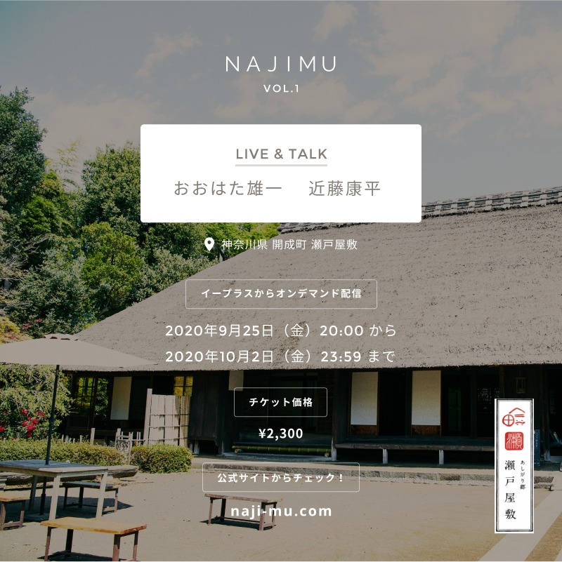 さらに特別企画として、瀬戸酒造店とNajimuによるオリジナル日本酒セットを限定販売。トーク中には同セットメニューを使用するので、おおはた雄一と近藤康平と一緒に、オンライン乾杯をしてみてはいかがだろうか?