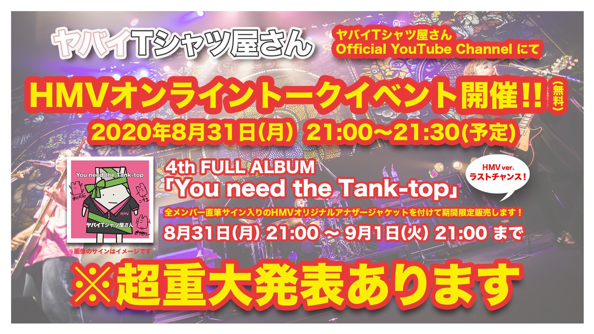 このイベント開始より24時間限定で、全メンバー直筆サイン入りHMVオリジナルアナザージャケット付きの「You need the Tank-top」購入ページが再オープン。HMV ver.のアナザージャケット特典付きで予約できるラストチャンスとのこと。