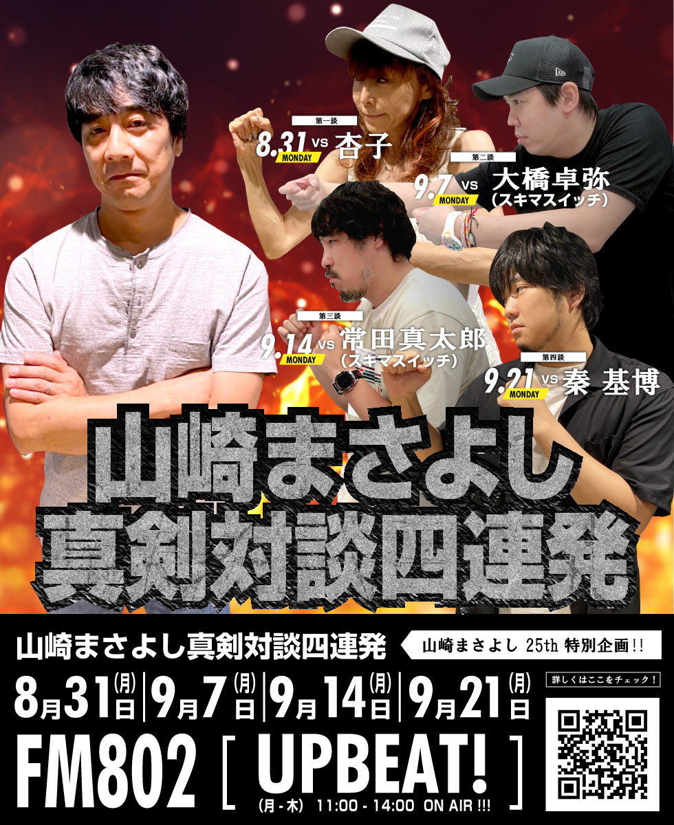 山崎まさよしが、大阪のラジオ局・FM802で放送されている『UPBEAT!』(毎週月曜~木曜11時〜14時、DJ加藤真樹子)8月30日(月)、9月7日(月)、14日(月)、21日(月)の12時台で、杏子、スキマスイッチ、秦 基博による「真剣対談」を行うことが発表された。