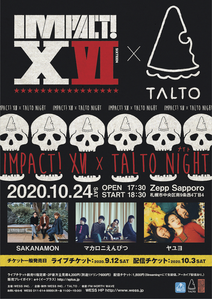 札幌のライブサーキットイベント『IMPACT!』が今年4月に実施予定だった『IMPACT! XV』は新型コロナウイルス感染拡大防止のため中止となったが、2020年10月24日(土)Zepp Sapporoにて、有観客ライブ『IMPACT! XVI × TALTOナイト』(インパクトシックスティーン、タルトナイト)の開催が決定した。