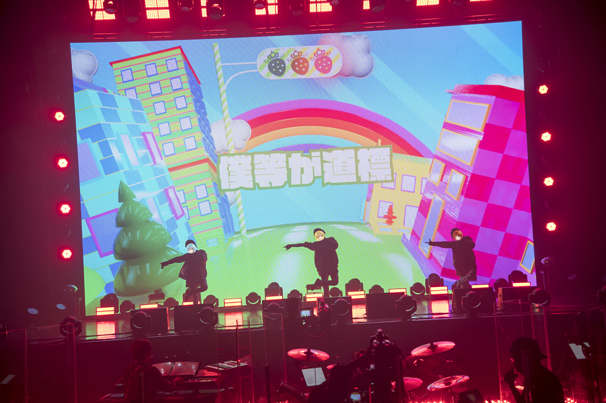 6人でいるときとはまた違った雰囲気が生まれるグループ内ユニットもおもしろい。「道標」「咲かせて恋の1・2・3!」をジャレ合いながら、かけ合いながら歌う奔放さは、莉犬、るぅと、ころんからなる“信号機組”ならでは。“信号機組”のパフォーマンスを受け、「かわいかったね!」と登場したのは、ジェル、さとみ、ななもり。による“大人組”。<全てはキミのため>と言い切る「キングオブ受動態」も、愁い色をたたえた「脳内ピエロ」も、大人な3人だからこそ歌えるのだ。