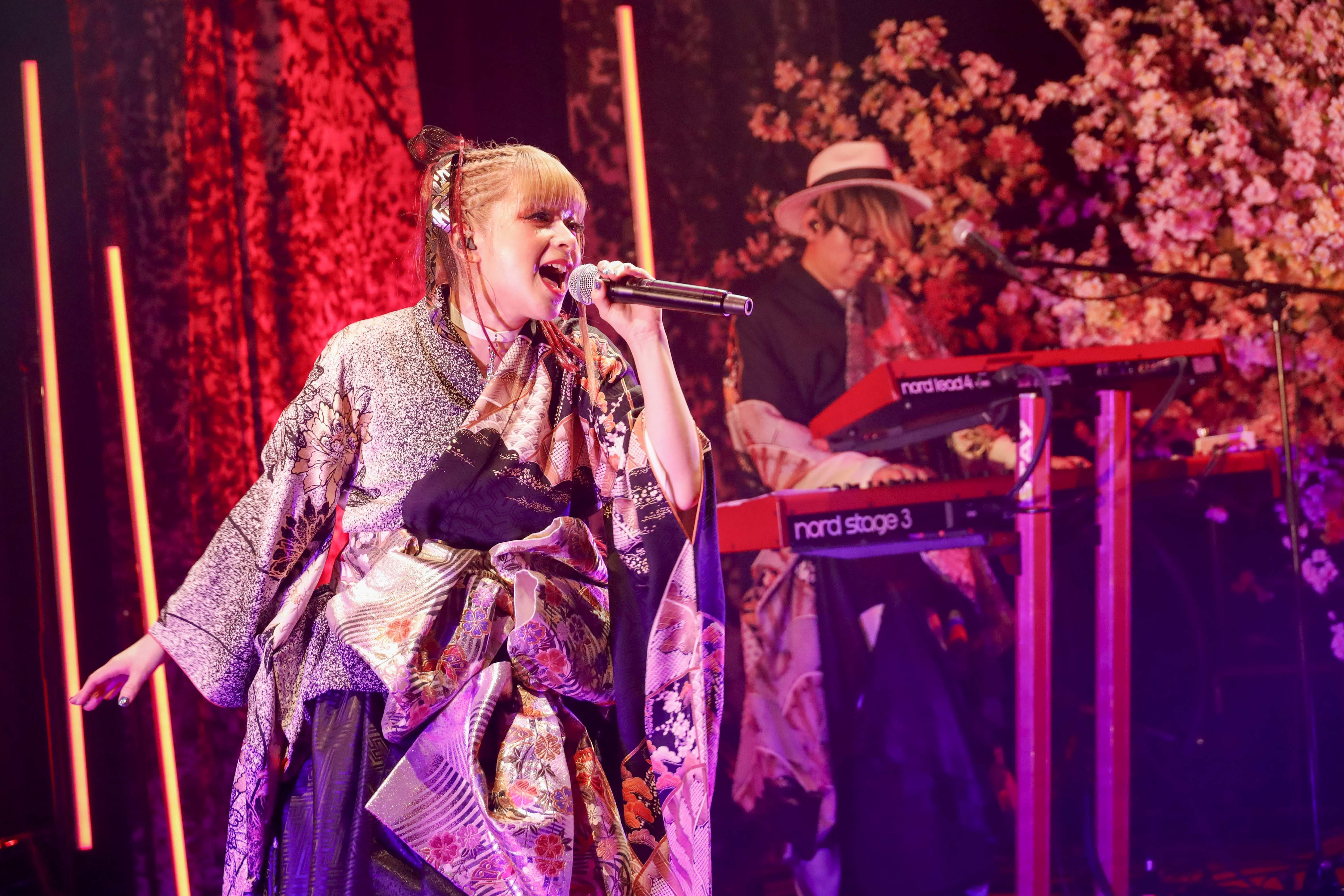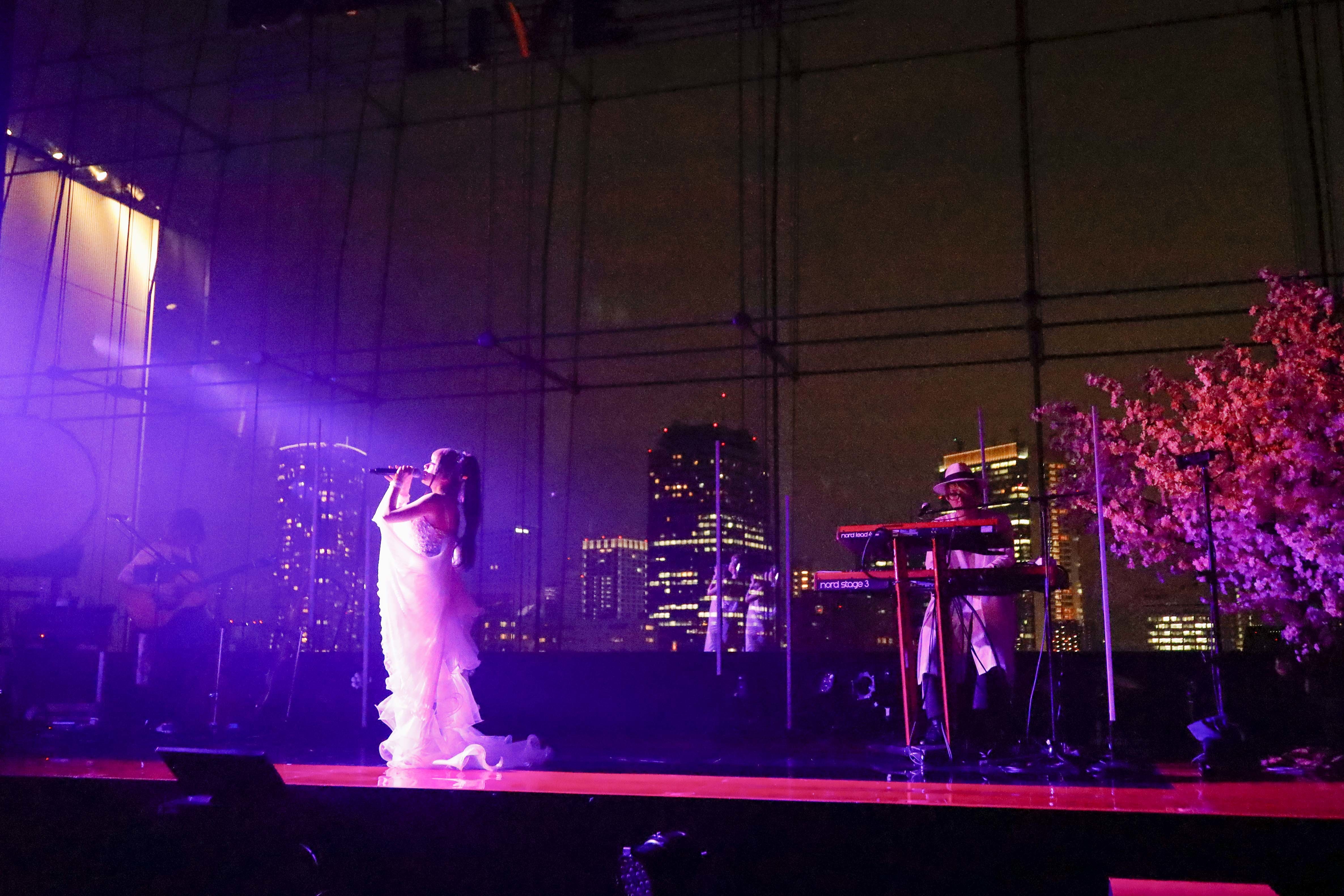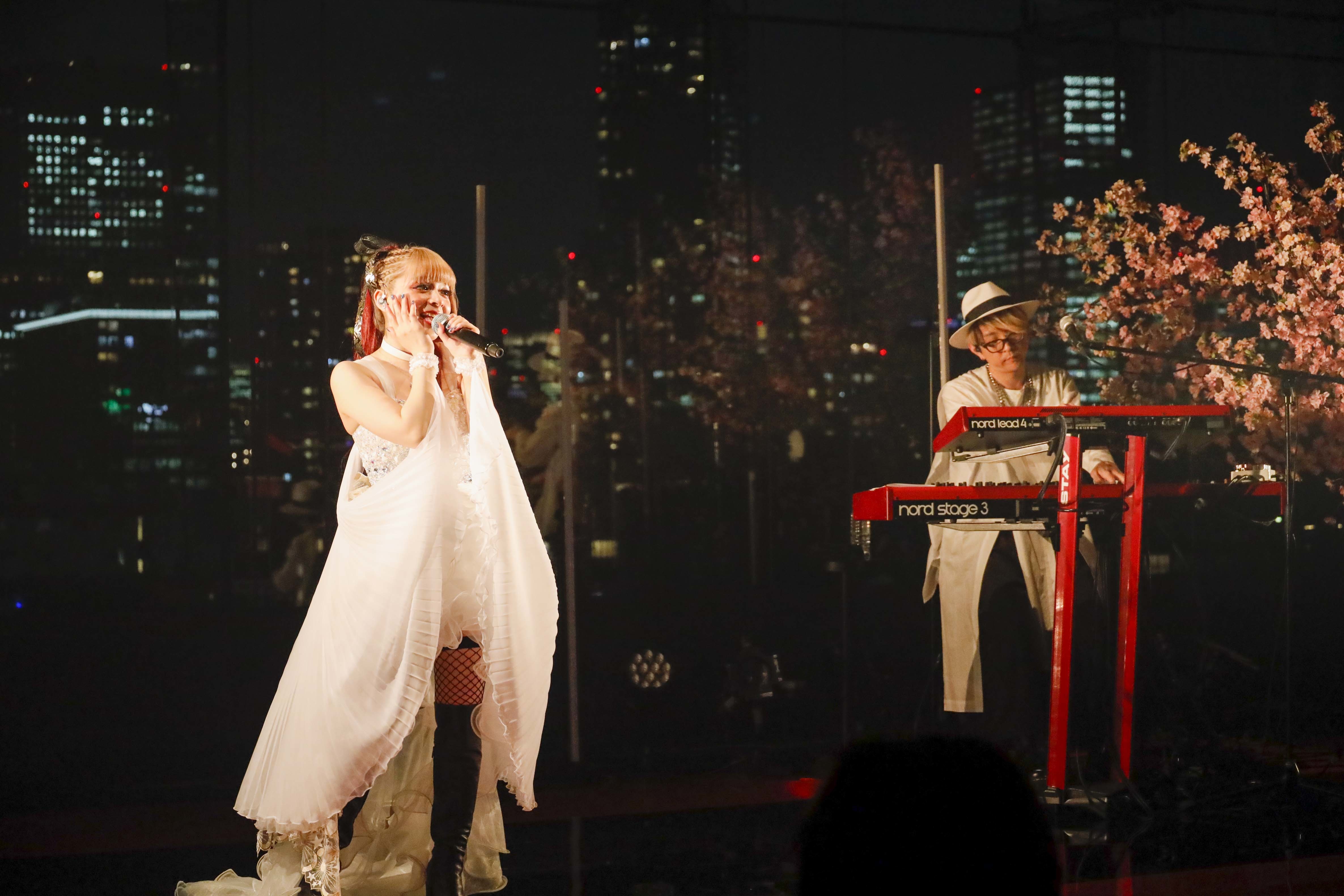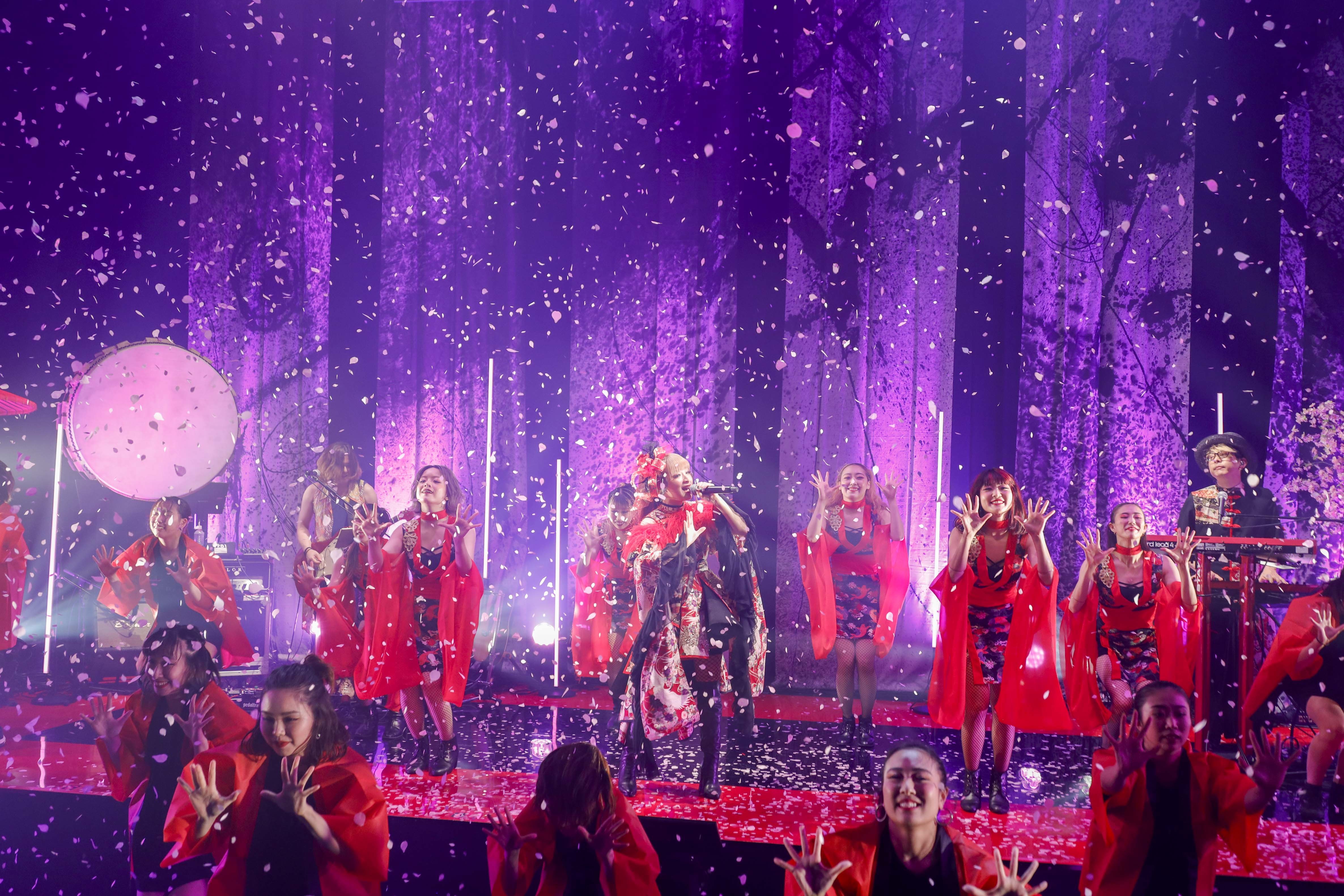 今回のライブは、舞台の背景にもこだわりがたくさん。和のイメージを取り入れた唐傘や桜、和太鼓、墨を散らした壁紙なども雰囲気たっぷりだ。さらにライブの中では、それらの装飾を取り払い、全面ガラス張りのステージ奥に見える東京の夜景をバックに楽曲が披露される、幻想的なシーンもあった。