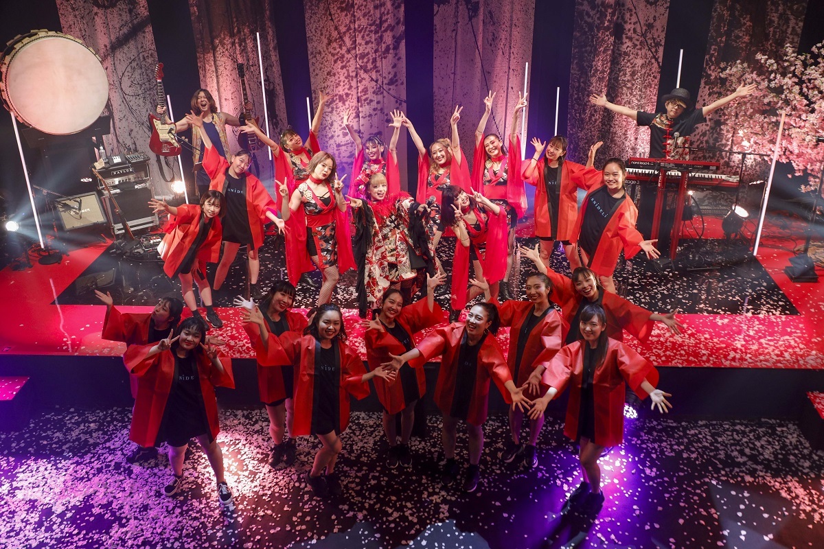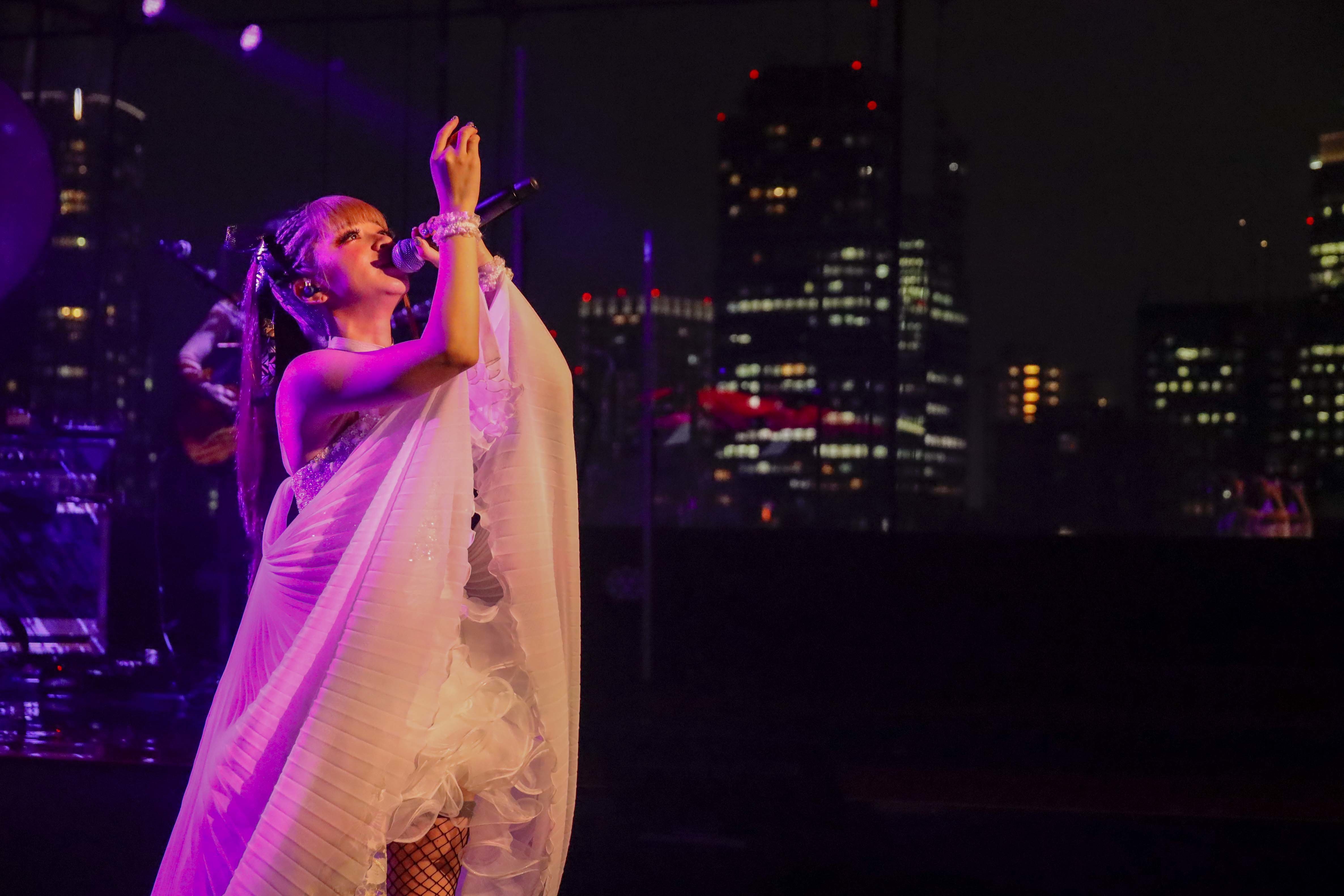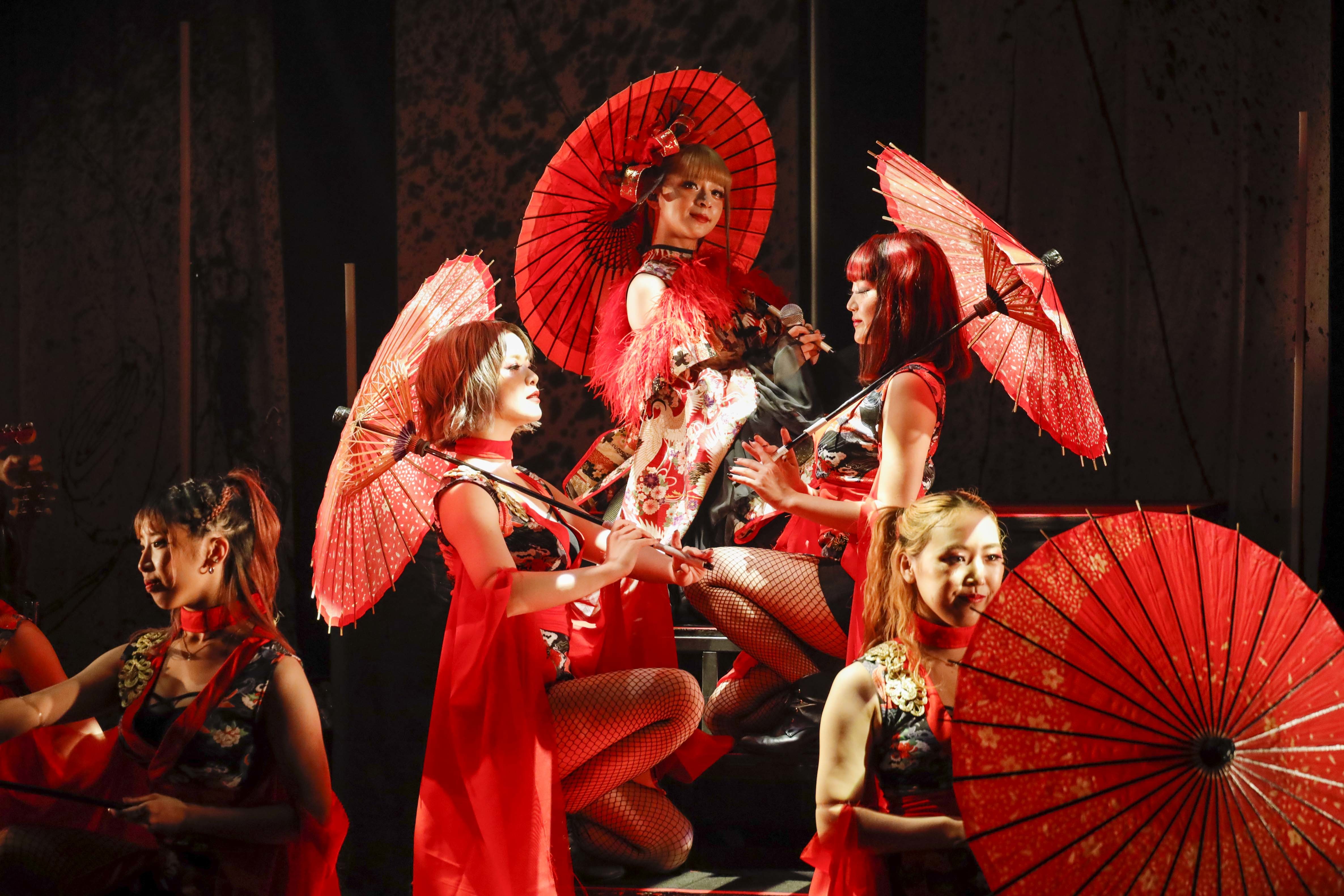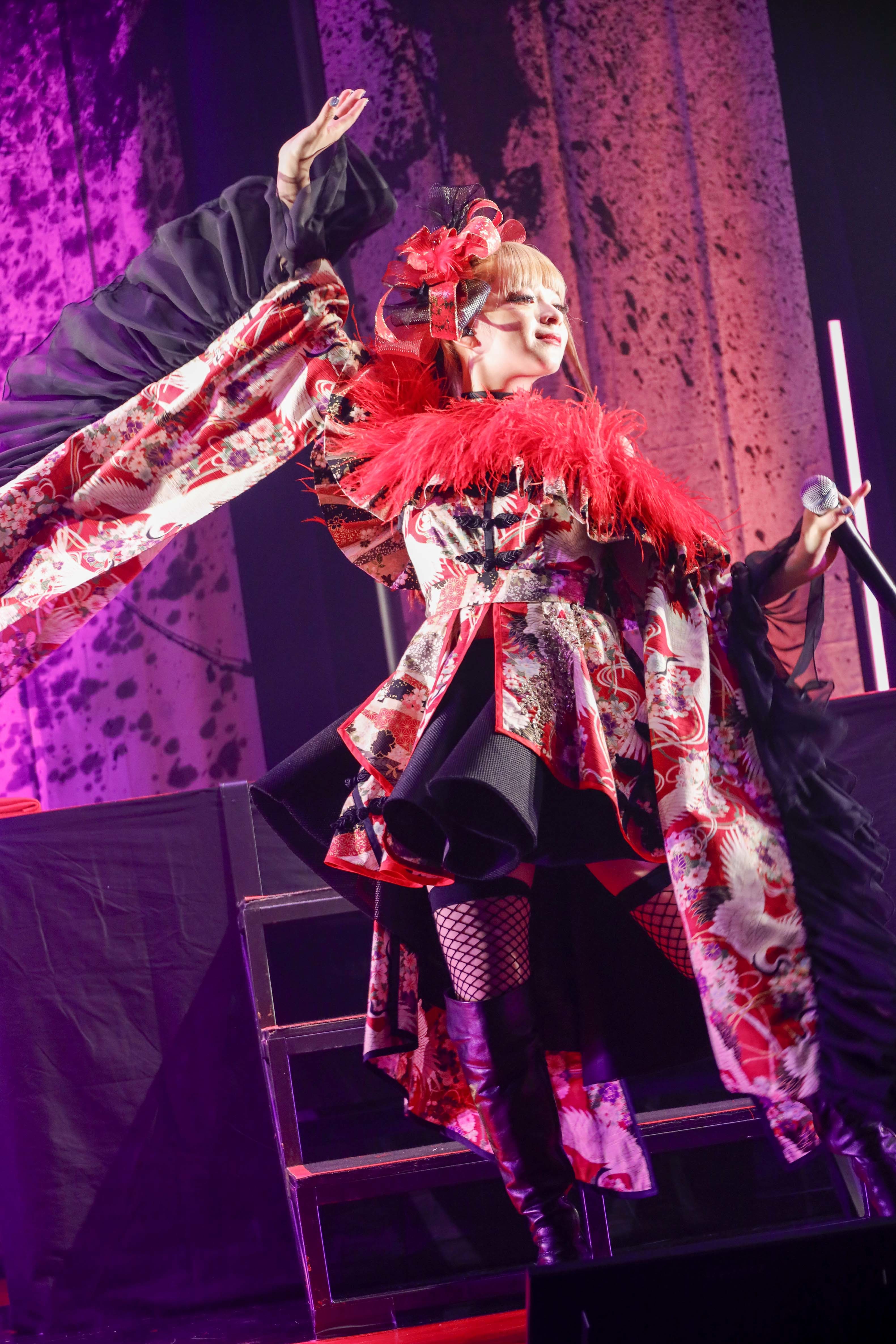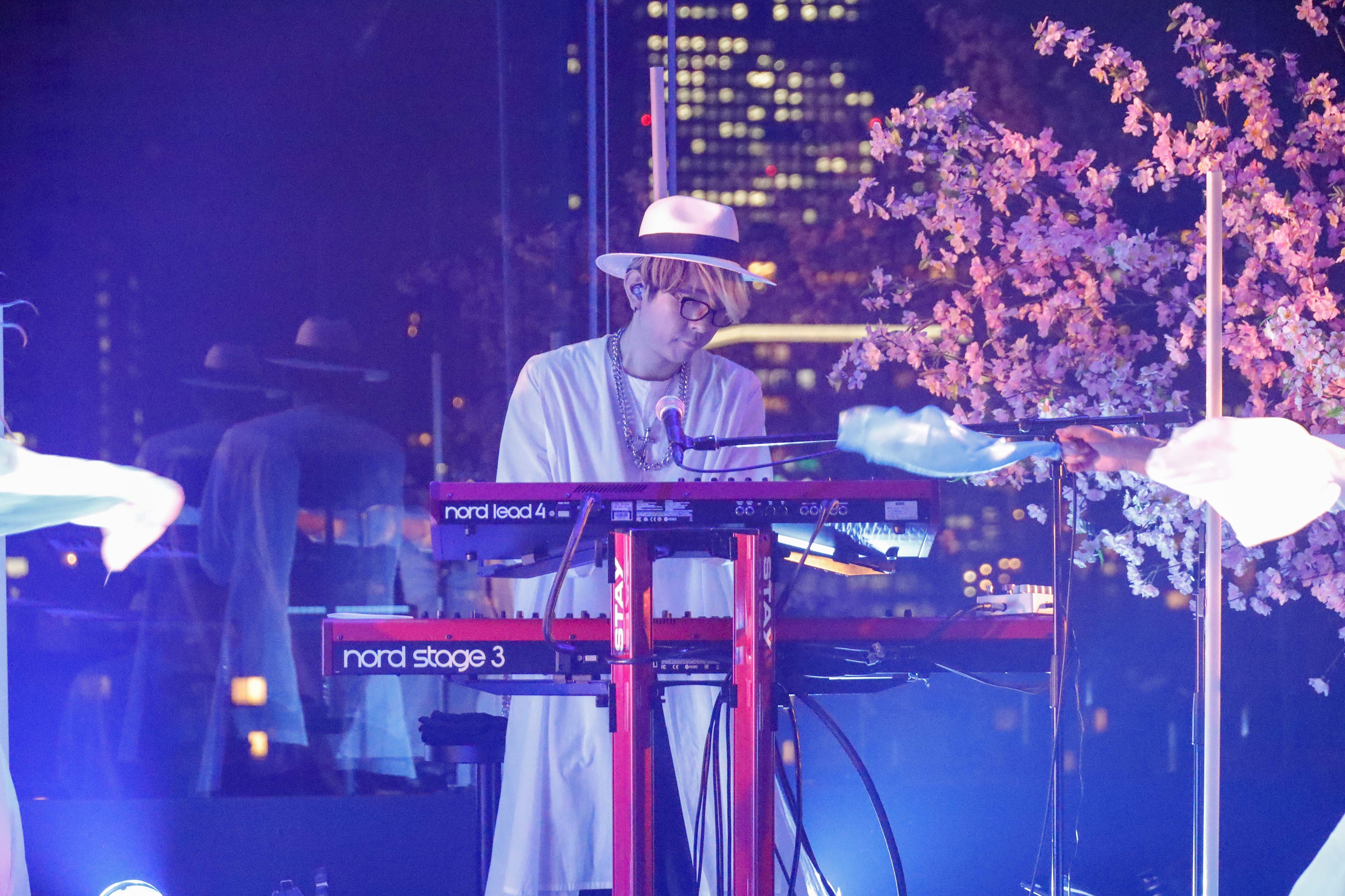 今回のライブは、舞台の背景にもこだわりがたくさん。和のイメージを取り入れた唐傘や桜、和太鼓、墨を散らした壁紙なども雰囲気たっぷりだ。さらにライブの中では、それらの装飾を取り払い、全面ガラス張りのステージ奥に見える東京の夜景をバックに楽曲が披露される、幻想的なシーンもあった。