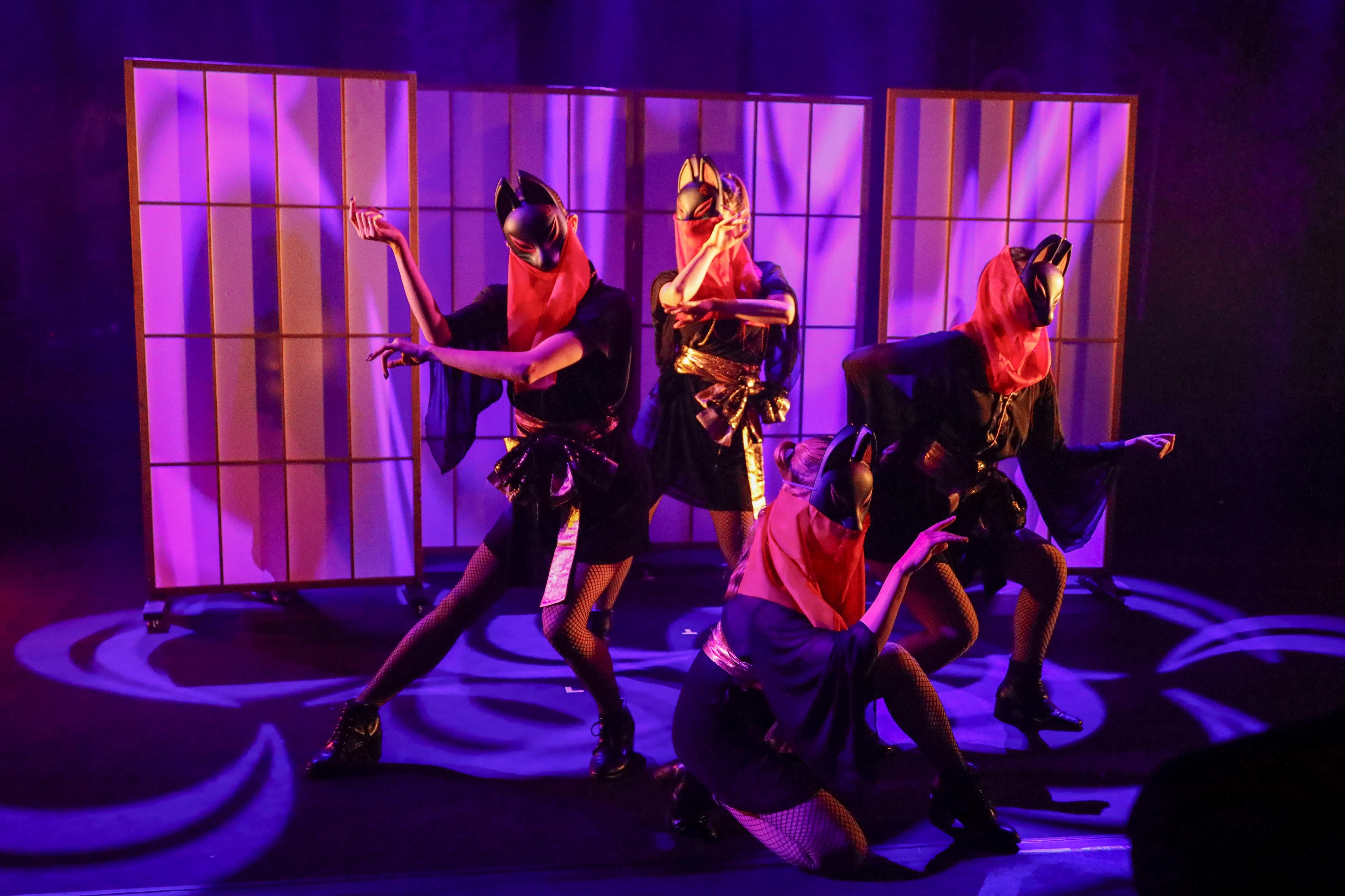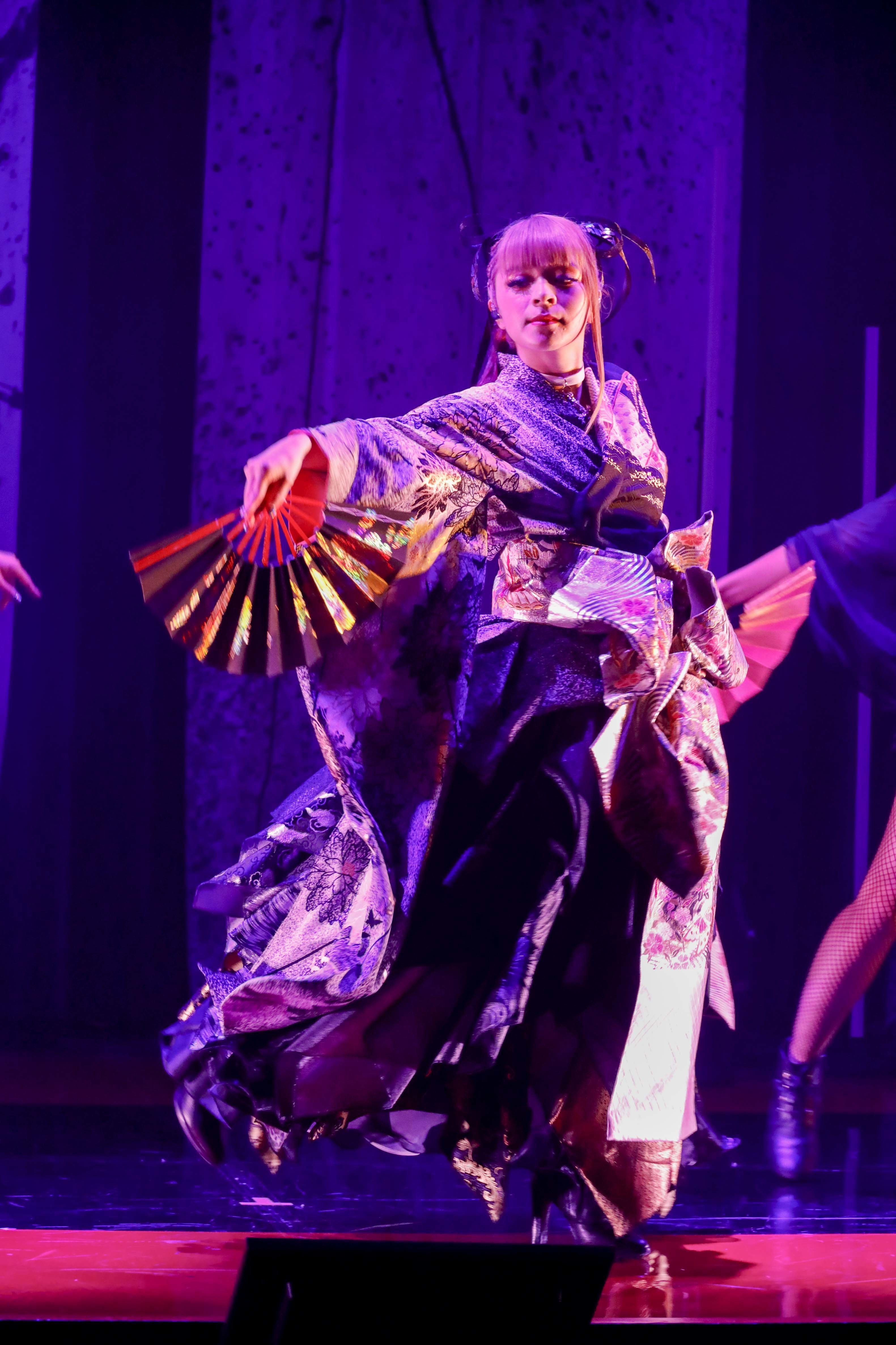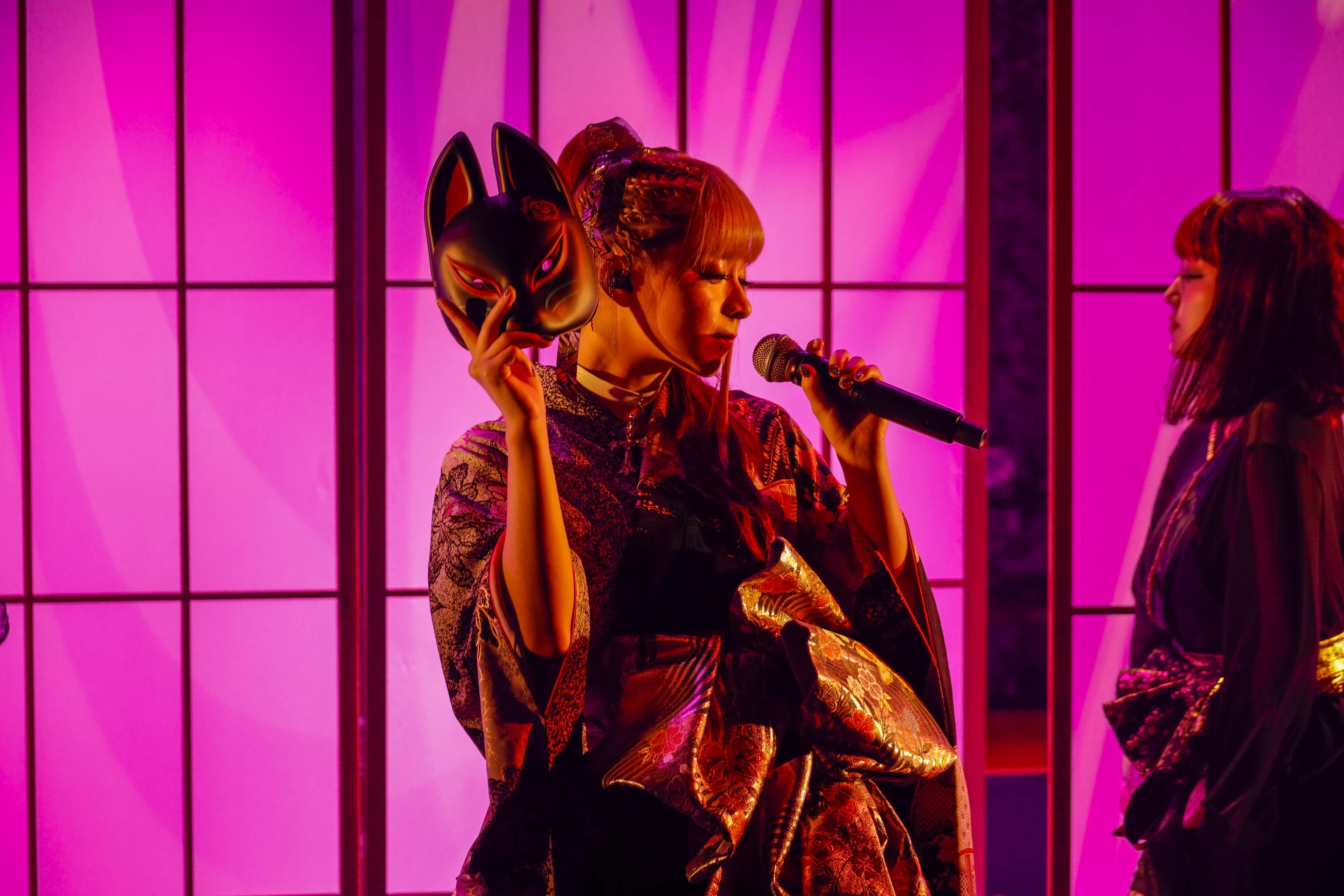 ライブ会場は、当然ながら無観客。しかし今回のライブはそれを逆手に取り、本来ならば客が座っているステージ前の空間まで広々と使ってライブは行われた。ステージの前に並ぶ障子を前に、流れるオープニングSEに合わせて踊る、和の衣装とキツネ面のダンサーたち。やがてステージに現れる、煌びやかな衣装に身を包んだメイリア。音楽も、衣装も、舞台も、和の要素をふんだんに盛り込んだ『東京紅夜』がいよいよ開催される。