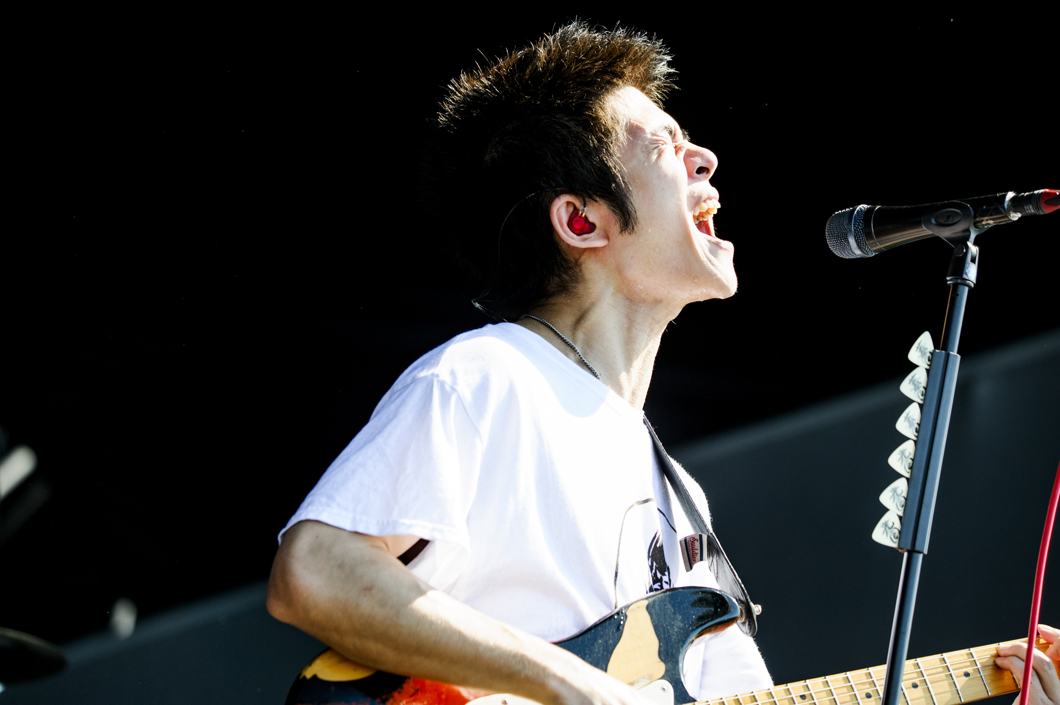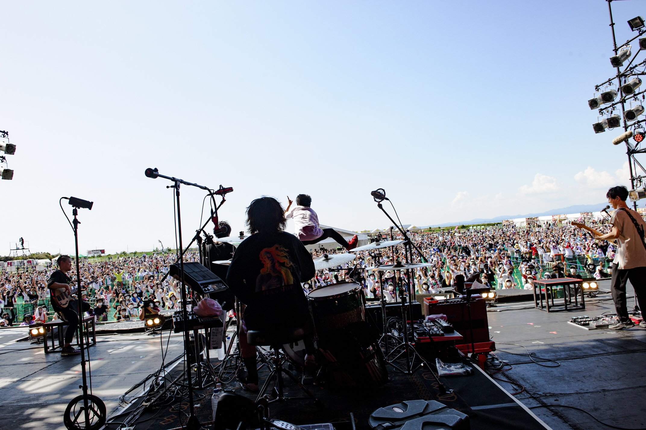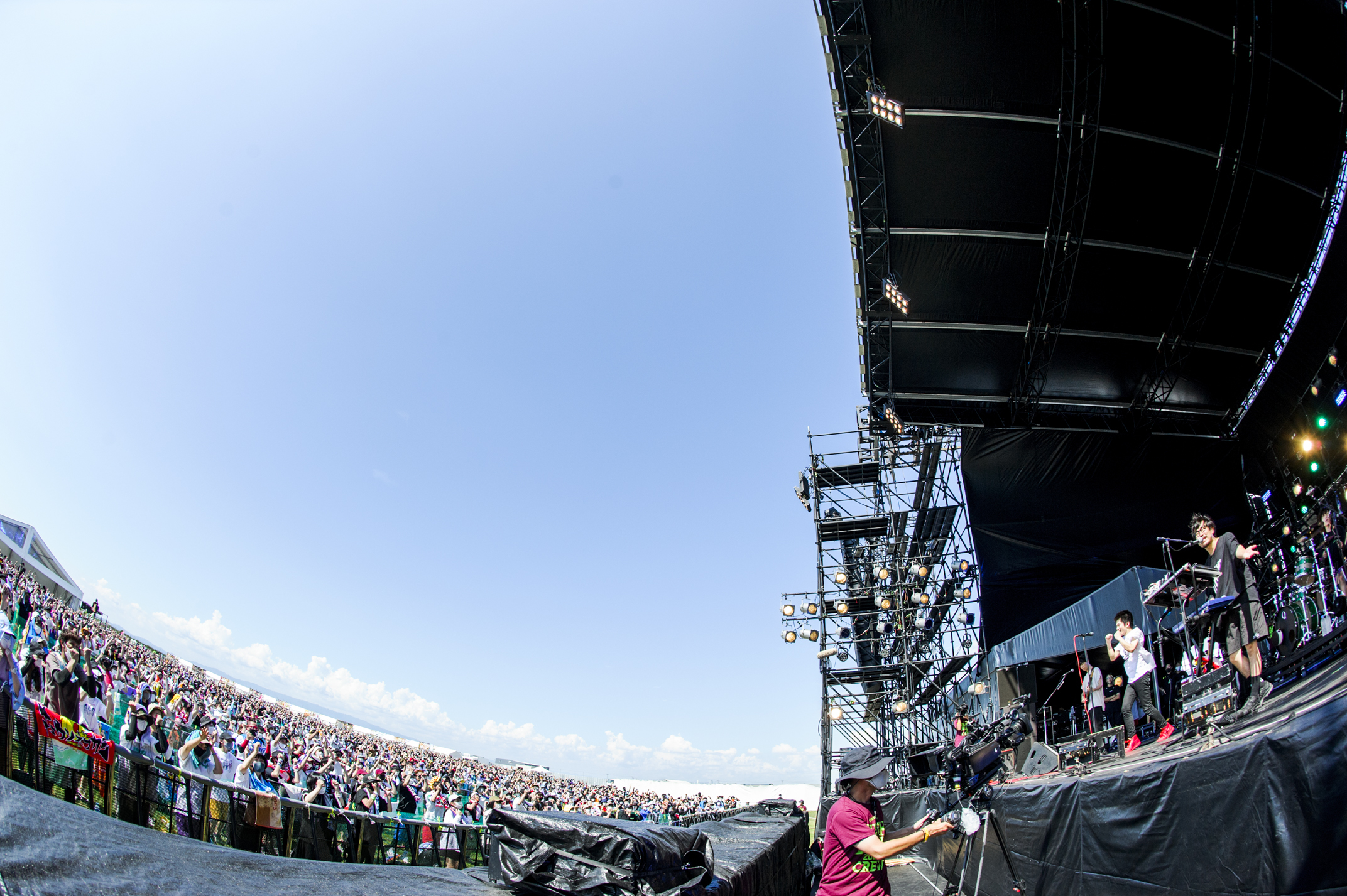 「今年唯一の日本の夏フェスに、お越しいただきましてありがとうございます! 何とかステージに戻ってこれました。みんなも元気そうでよかったです。僕らは裏ではたくさん活動してたんで、新曲をやっていきたいと思います!」とお披露目したのは「おいしい怪獣」。シンセリフがリードするこの曲を演奏中も照り付ける日差しは容赦なく、あまりの暑さに「いや~キツい!」とつい本音を漏らすセイヤ(笑)。