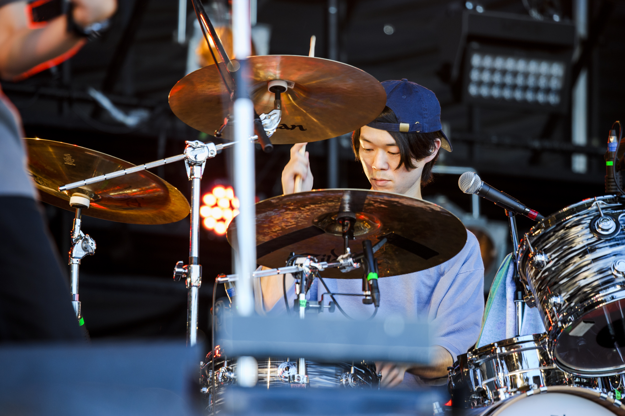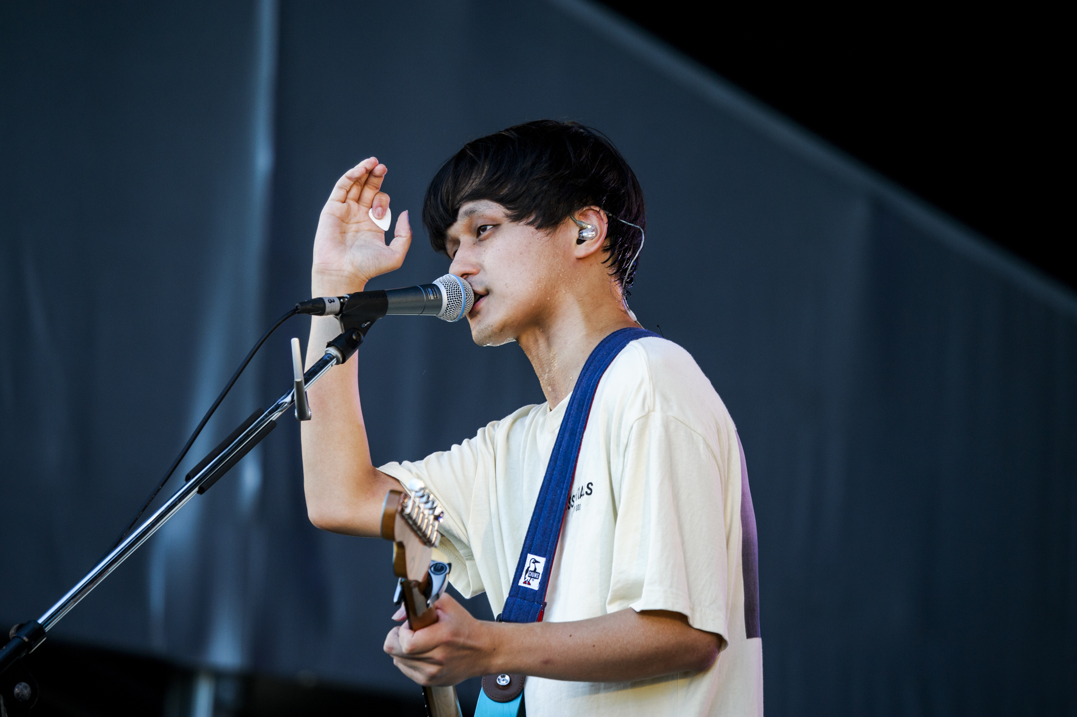 距離をしっかり確保するための目安として等間隔に黄色いリボンが結ばれたスタンディングエリアには、準備万端のオーディエンスが待機。そんな期待感の中、SEが流れるなりあたたかい拍手で迎えられたのが、オープニングアクトのハンブレッダーズだ。しょっぱなの「DAY DREAM BEAT」は、晴天の泉大津フェニックスにバッチリハマる爽快感たっぷりのナンバー。昨年、ATMC初日のトリのステージでも1曲目に放ったこの曲が、今では何倍もの大きさの舞台で鳴り響いている。この1年のハンブレッダーズの歩みが如実に現れた幕開けから、疾走感もそのままに「ユースレスマシン」のドライヴするビートに乗せて歌われる蒼い風景が、スーッと胸に沁み渡っていく。