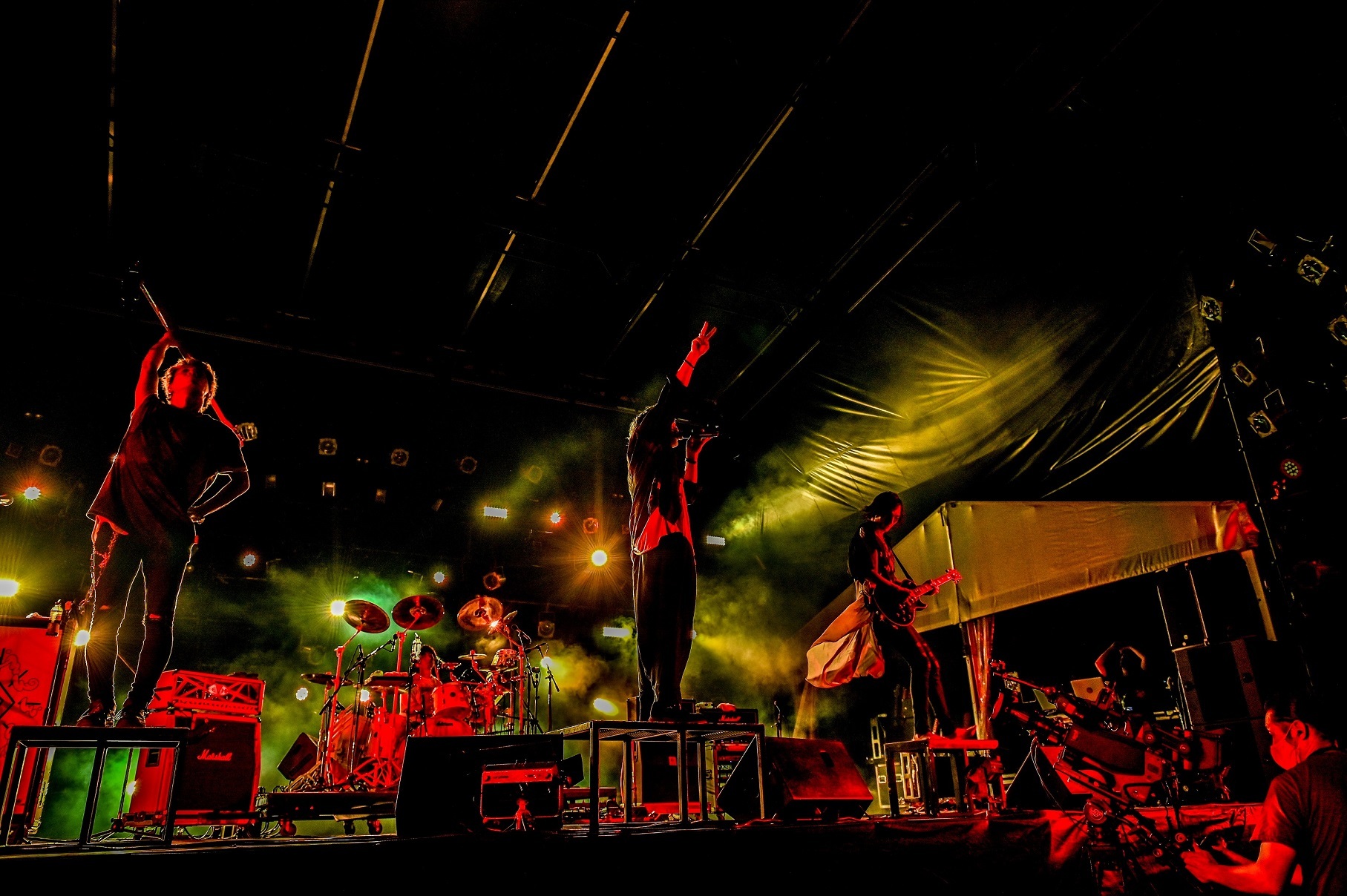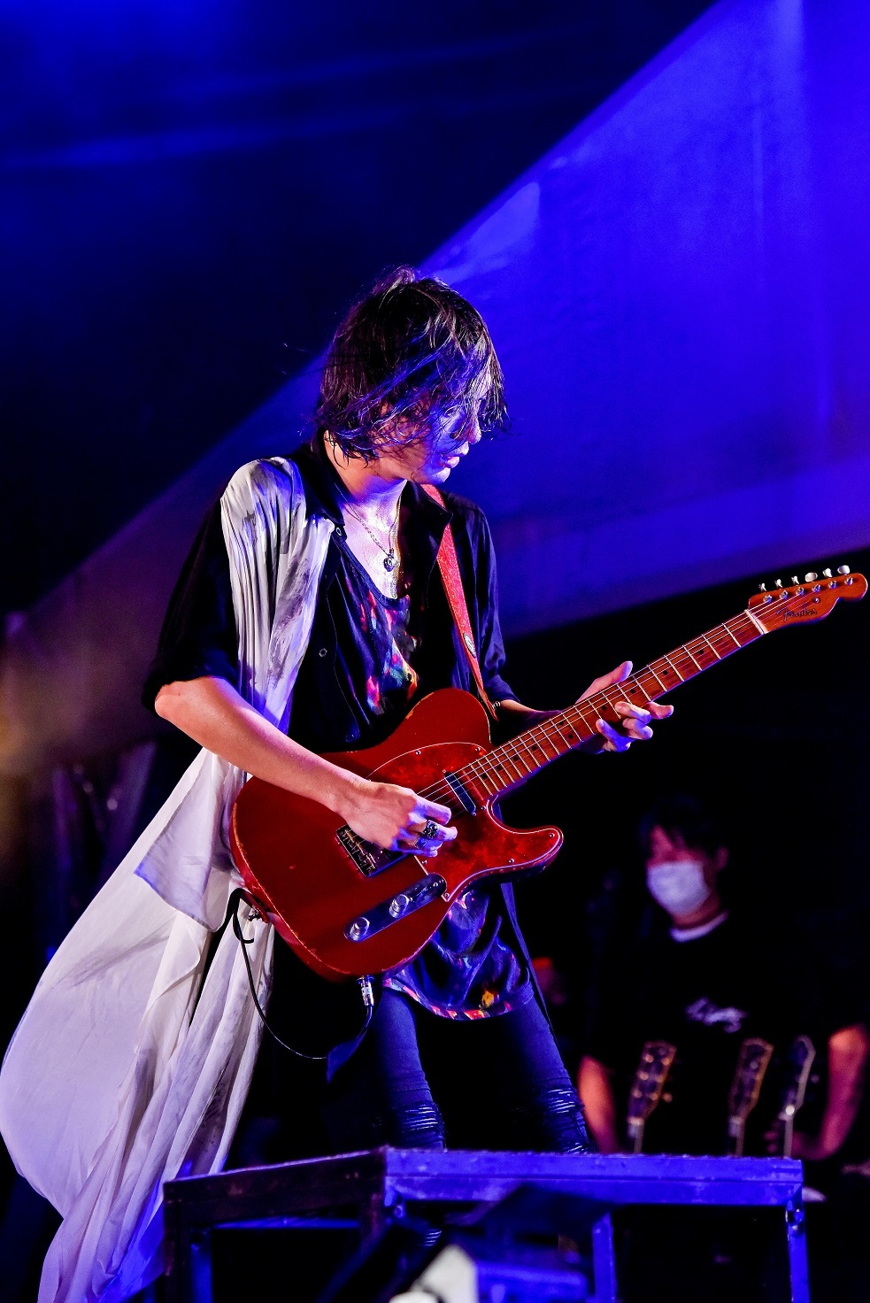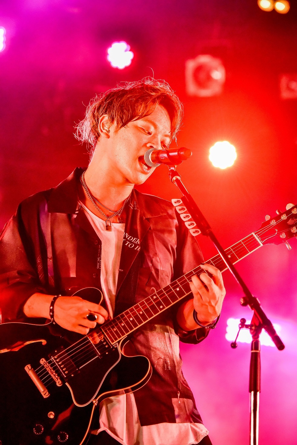 そう言葉にしたとおり、続く「カンタンナコト」では彼らの“通常運転”=ヘドバンの嵐が生まれる壮絶なステージングを展開! 中西雅哉(Dr)が打ち鳴らす怒涛のビートと、軽やかにステップを踏みながら躍動するあきらかにあきら(Ba.Cho)。そんなリズム隊ふたりの重厚な存在感もビリビリ全身に迫りくる。極彩色のライティングを背負いながら、ハンドマイクで縦横無尽にステージを駆ける山中は、高潔な歌声の素晴らしさはもちろん、妖艶な表情をたたえつつ指先の先まで美しく魅了するショーマンシップを発揮し、その様には脱帽の一言だ。