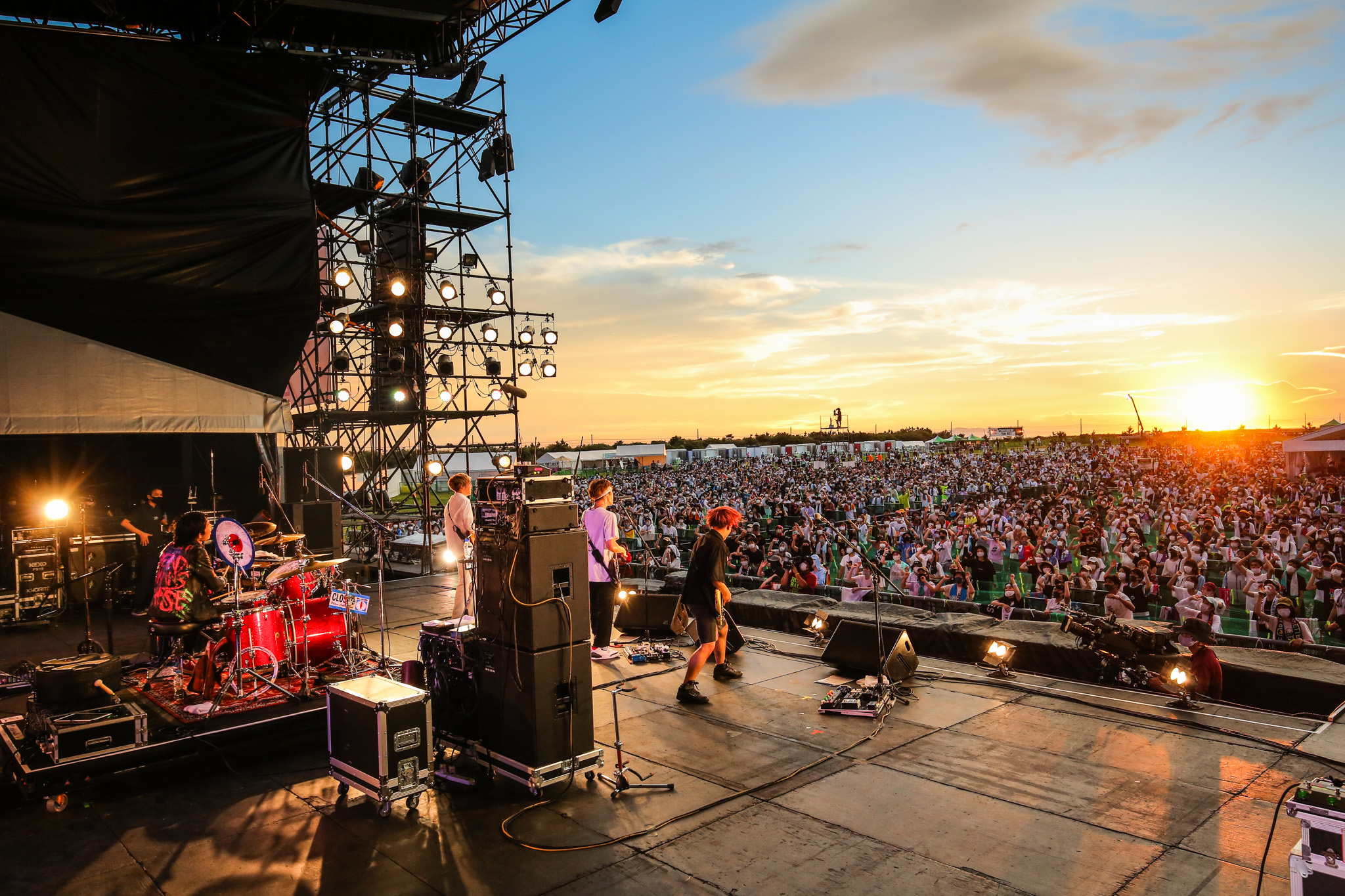「気候も良くてみんな踊りやすくなったんじゃない? 余裕があったら後ろの夕焼けを振り返ってみて。音楽だけじゃなくて、こういう自然だったりいろんな環境も込みで、(野外イベントは)やっぱり楽しいよな!」(牧)。陽が沈み始める時刻、オレンジ色に染まるドラマティックな景色すらもgo!go!vanillasのステージを祝福しているかのようだ。