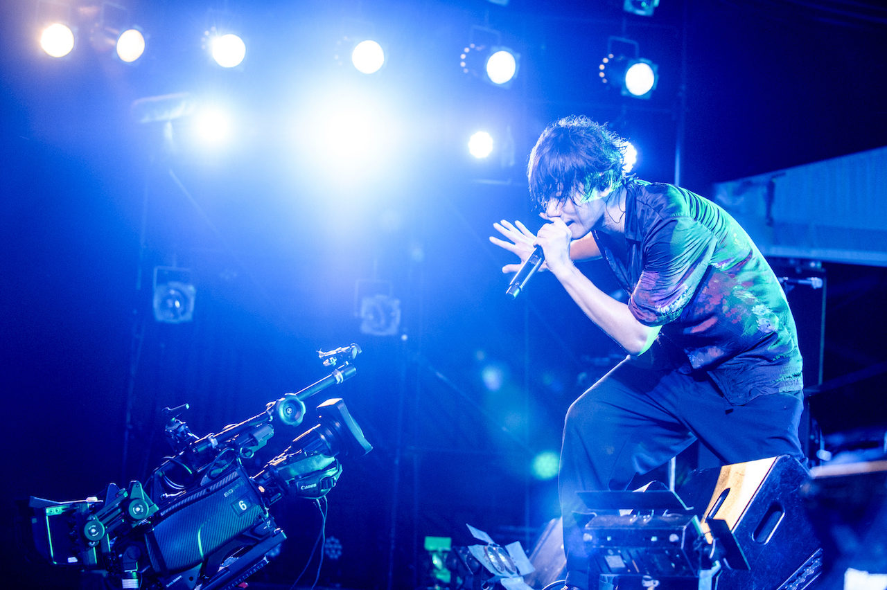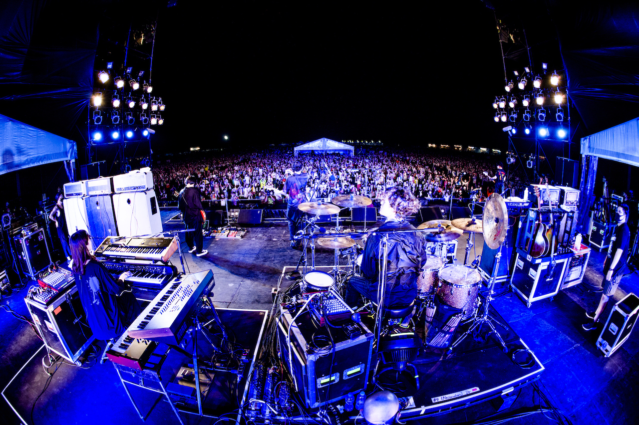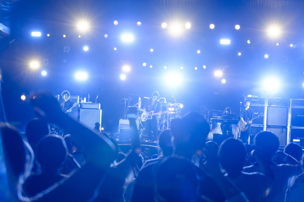 まずは、自宅でのリモートで制作した新作コンセプトアルバム『Bedroom Joule』から「Run Away(Bedroom ver.)」をプレイする彼ら。原曲が持つ沸騰状態の熱とは違い、ふつふつとした高揚感をもたらすリアレンジで、すっかりナイトモードにスイッチした泉大津の地を心地よくサーフする川上洋平(Vo/Gt)。かと思えば、続く「ムーンソング」では川上と白井眞輝(Gt)が奏でる鮮やかかつリリカルなツインギターで、一気に加速度を増していく。