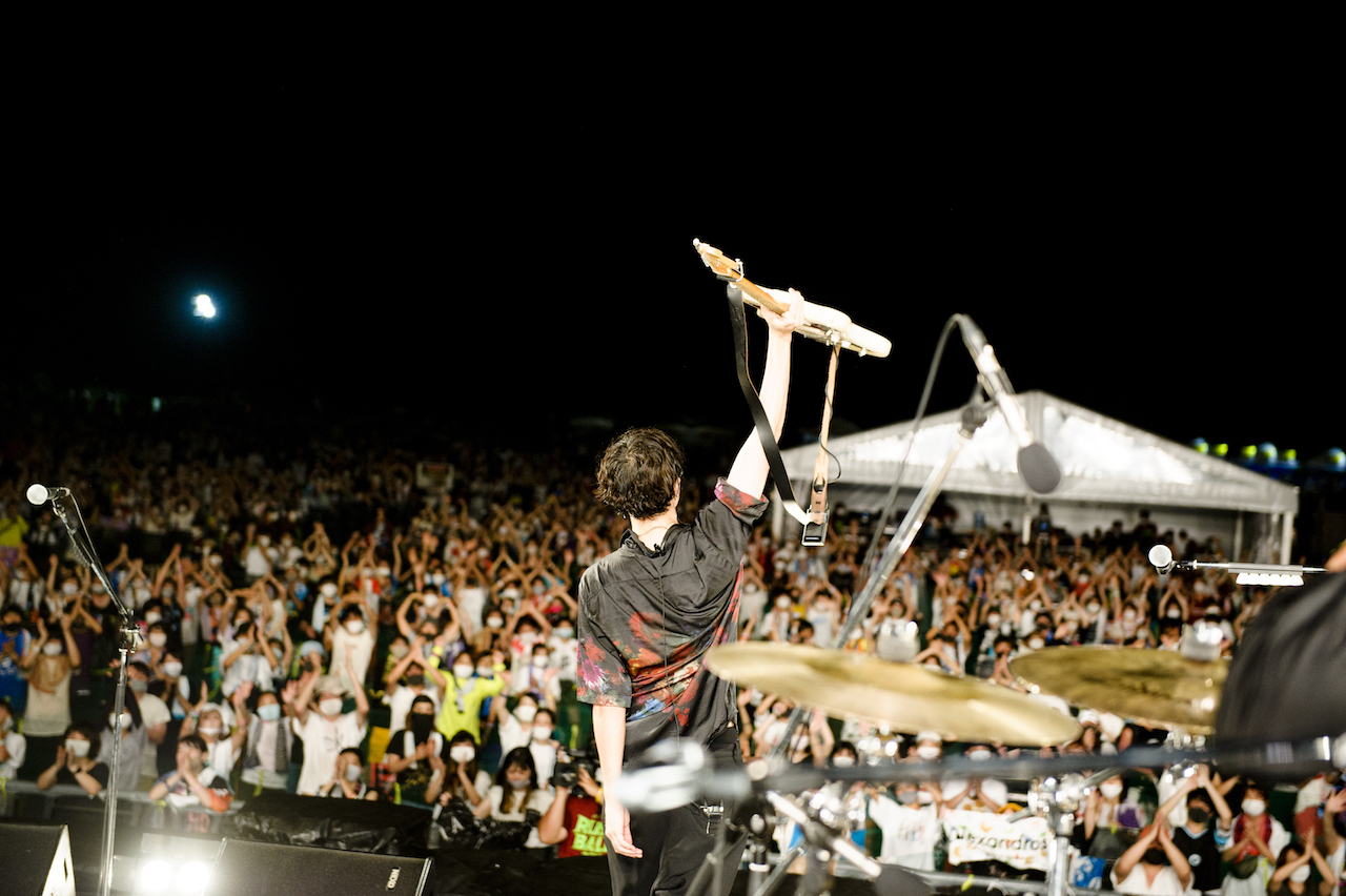 自らや他者を守るための制限はありながら、こうやって新しいかたちでの野外イベントが実現できたことは、紛れもなく希望の光に違いない。「また会えることがあれば、その時は本当に笑い合えたらいいなと。そんな曲を」(川上)とアコギに持ち替え、続くは「rooftop」へ。離れ離れの恋人を思う詞世界は、そのままライブへの思慕と重なるようだ。オーディエンスはやわらかな音世界に横揺れになり、魅入られたように没入。バンドがコロナ禍で得た新たな音像は、ライブの楽しみ方を緩急自在に教えてくれる。