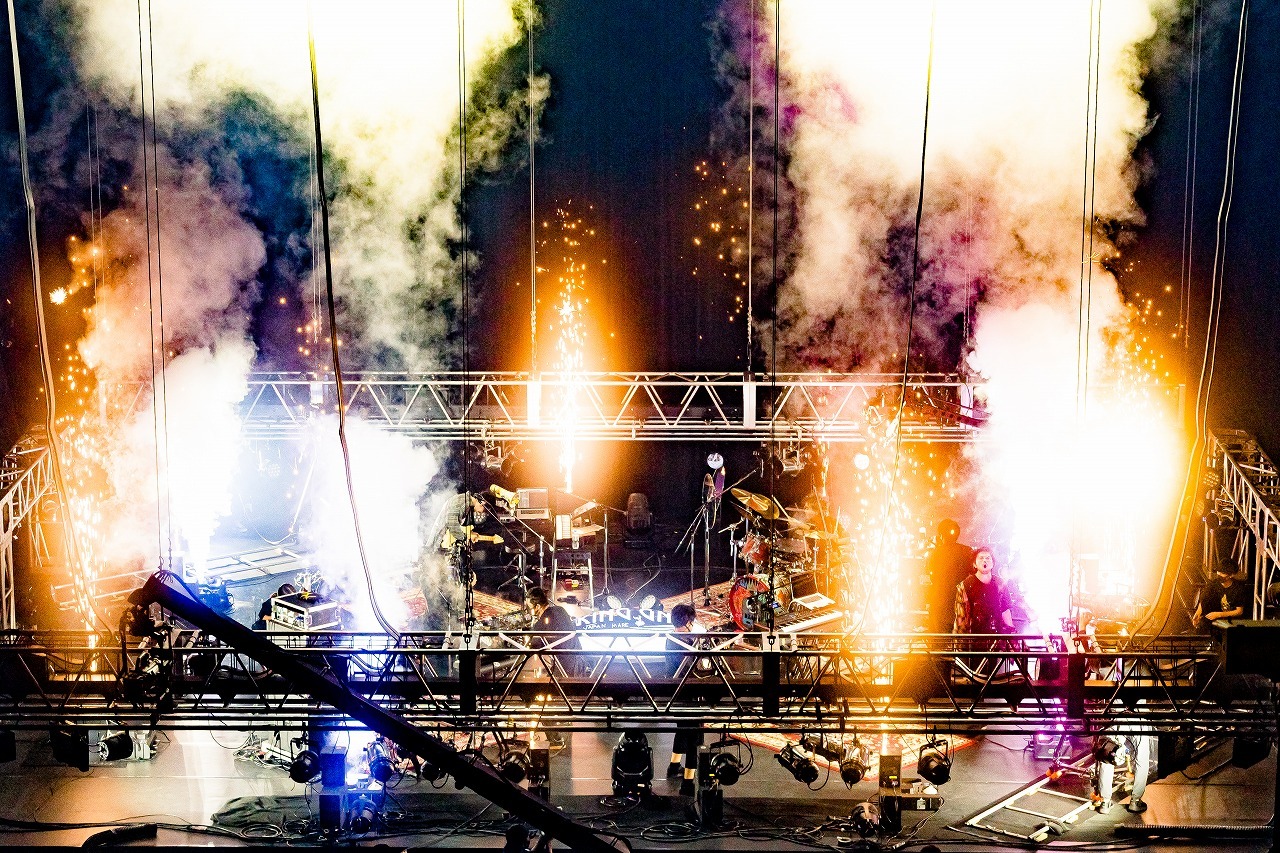 無観客であっても、画面の向こうにいるリスナーと時間軸を超えて繋がれるのがKing Gnuライブの凄みだ。ミュージックビデオのイメージから楽天的な雰囲気もある「Teenager Forever」だが、実はシリアスな人間関係を匂わせる歌詞フレーズに着目したい。音楽ありき。人生は一度きり。一期一会なロック初期衝動が、ひさしぶりなライブパフォーマンスとしてこれでもかとパンキッシュに炸裂していく。ラストシーンは、ステージ上に火花も上がり、井口による「画面の前の皆さん、ありがとうございました!」の一言で終了した。