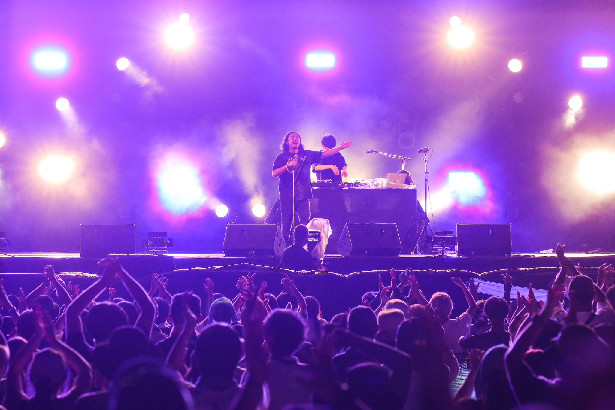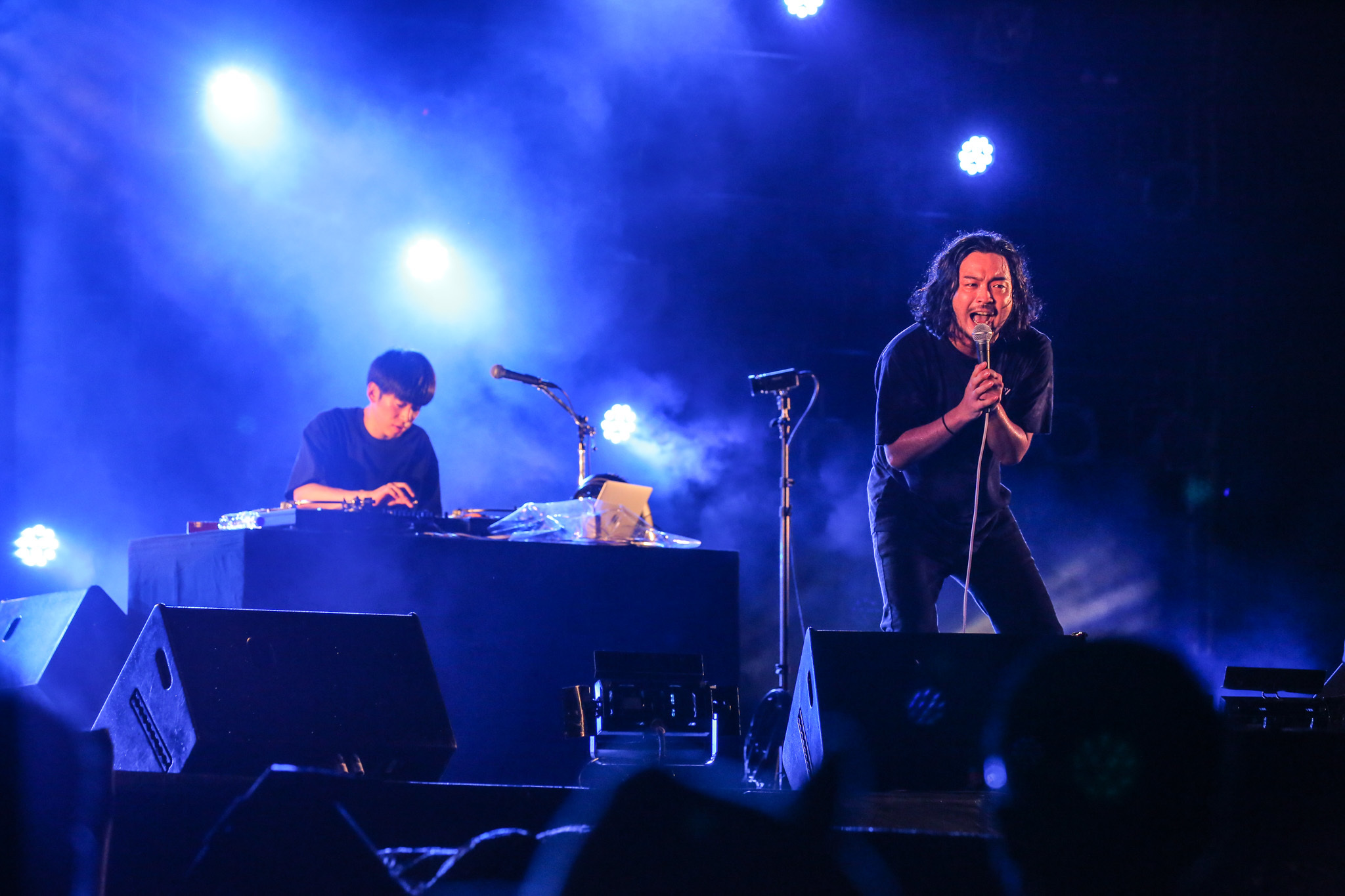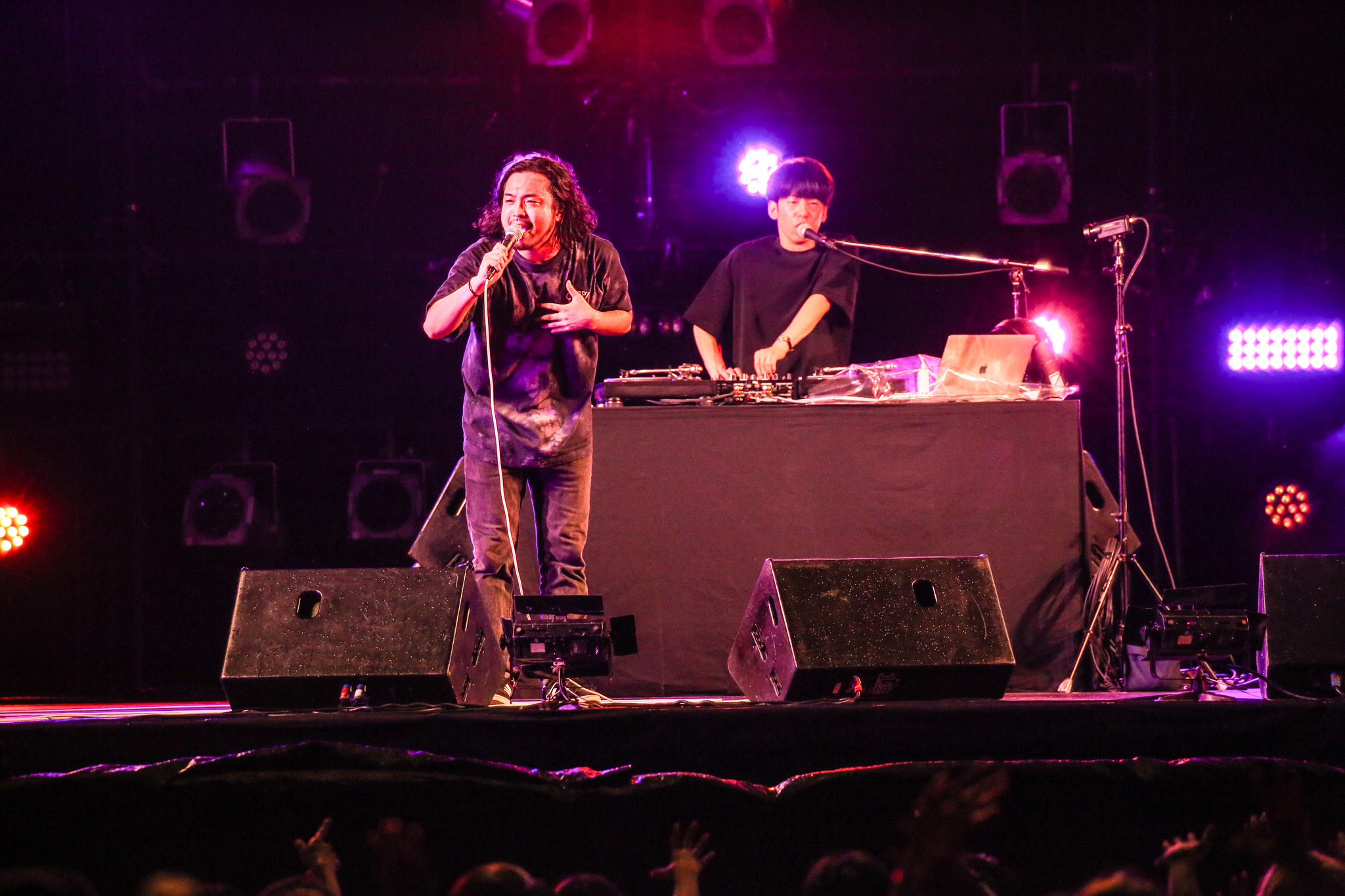 ライブ定番の「助演男優賞」「合法的トビ方ノススメ」ではR-指定の「心の中で歌えー!」との煽りにサイレントで応える熱狂が湿った空気の中を伝わっていく。2人とも全身黒の衣装に、飾り気のない真っ黒のDJブース。まさにマイクとターンテーブルだけでどんどんこの場を掌握していく様は圧巻だ。