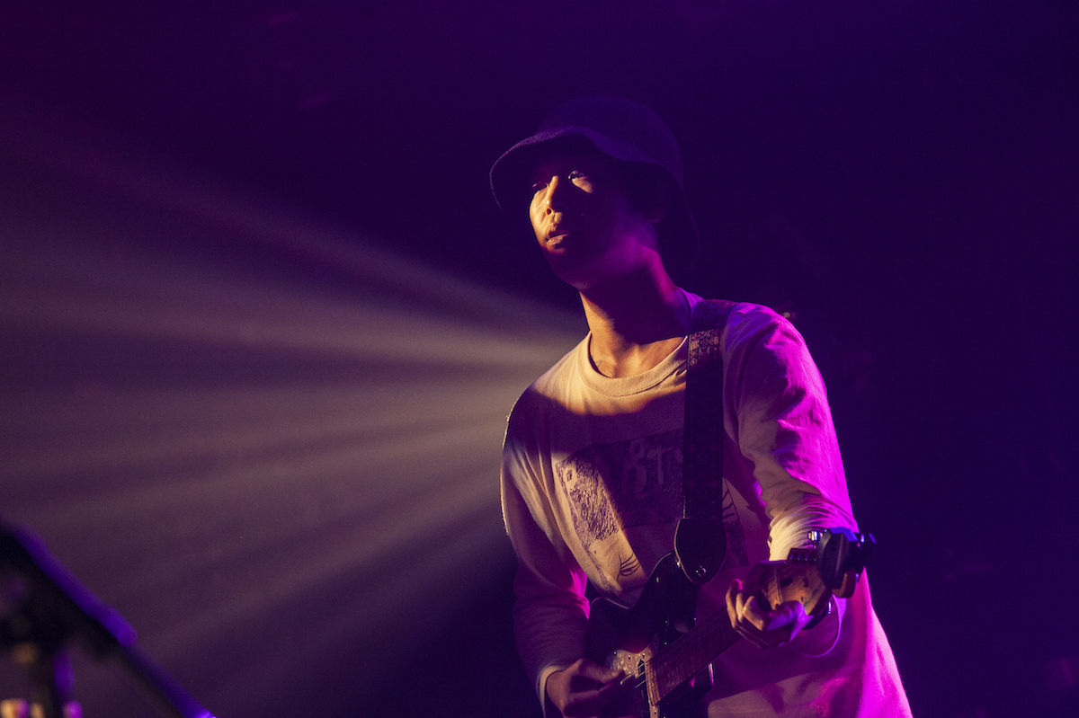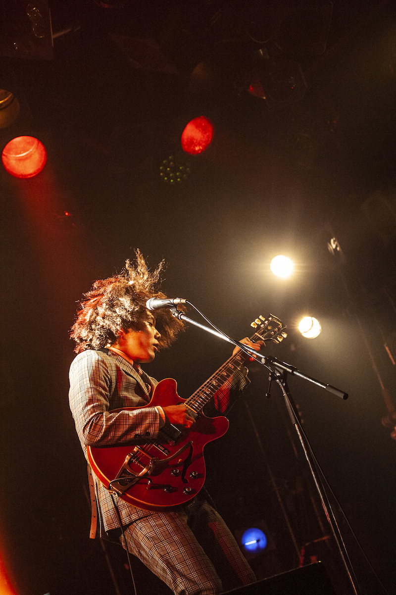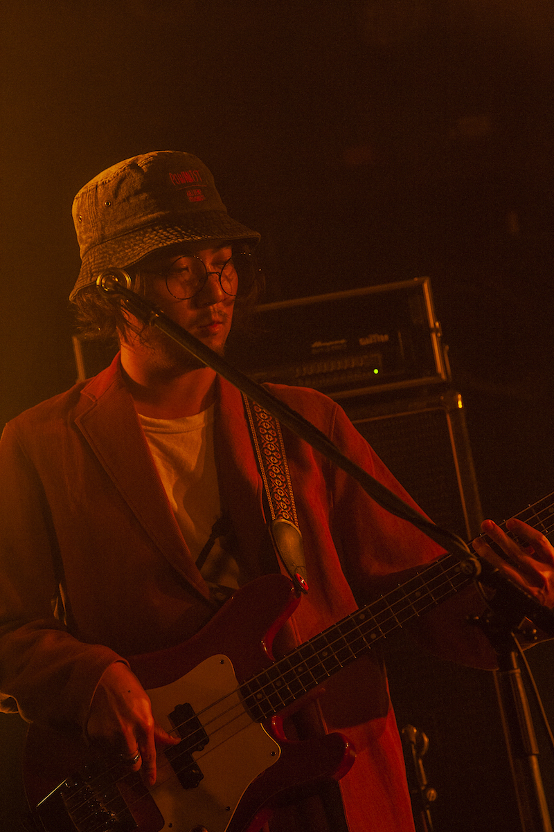 そして「さよこ」でライブがスタート。フォーク/ソウル色を感じる音像も、<君は80年代の女/名無しの女><僕は40年先の未来から君を見つけたあよ>という歌詞も、非常にロマンティックな曲だ。そのムードはヤナセの低い歌声にも似合っている。一転、ギターがギュイーンと鳴いてから始まる「失踪」ではガレージロックが牙をむく。音源と雰囲気が全然違うのも驚くべき要素だ。曽我部恵一やクリープハイプなどのリミックス音源を手がけ、“鬼才”として話題を呼んでいるbetcover!!。ヤナセの脳内で鳴る宇宙を体現するかのように、次々と様相を変えていく(カメレオン俳優ならぬ)カメレオンバンド。ドラムとベースから始まり、途中にはギターの2人が向き合って楽器を鳴らす場面もあった「さみしがりな星」では、誰かが演奏しているときにそれ以外の人がノリノリになっている様子もカメラがしっかり捉えていて、バンドのいい空気感が伝わってきた。