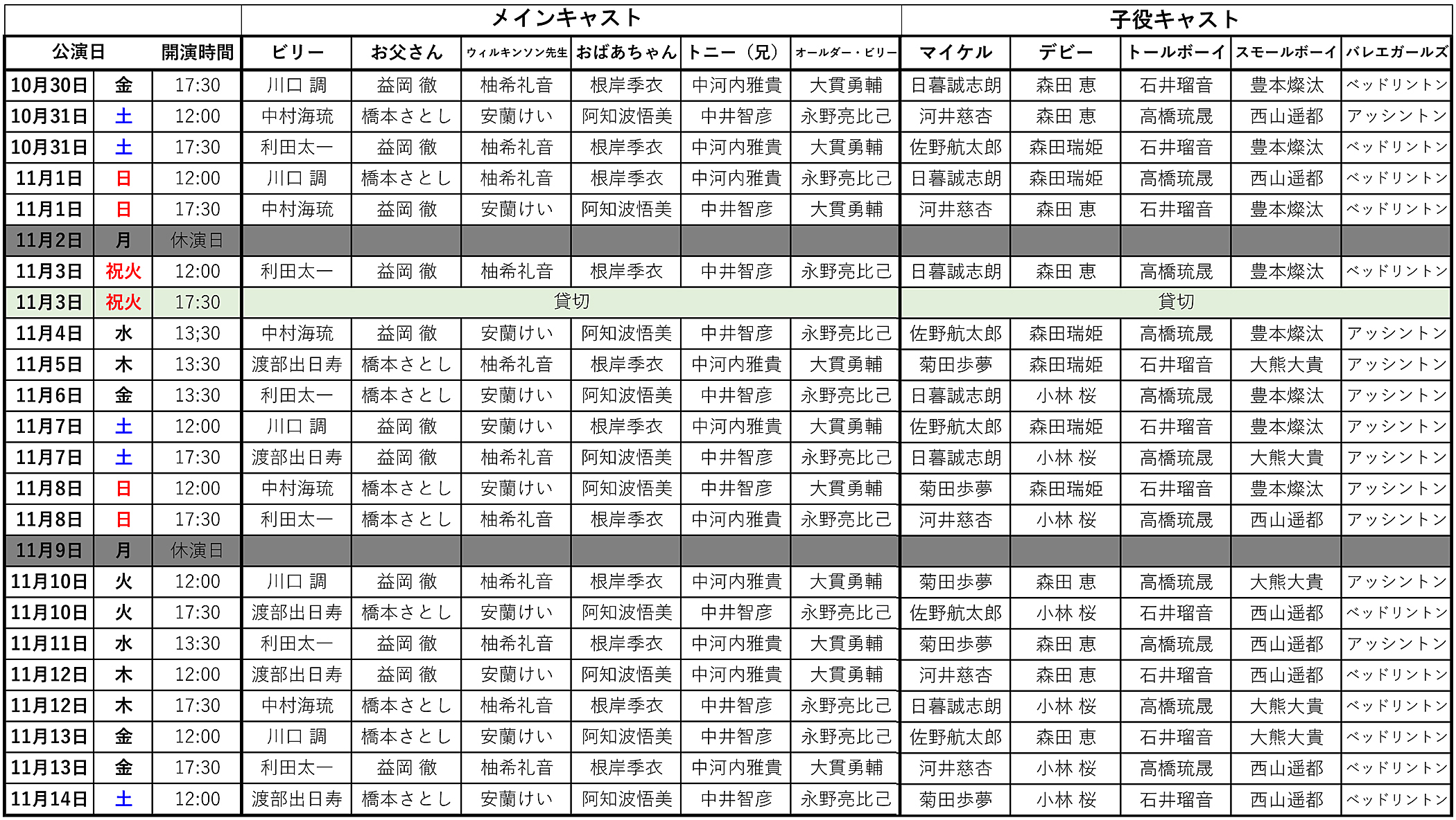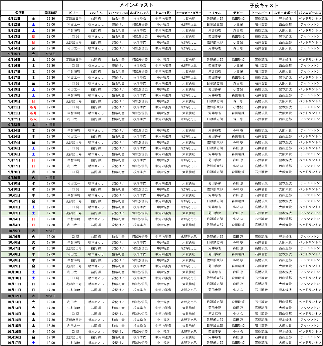 ■オープニング公演・東京公演 メインキャスト/子役キャスト ローテーション表
