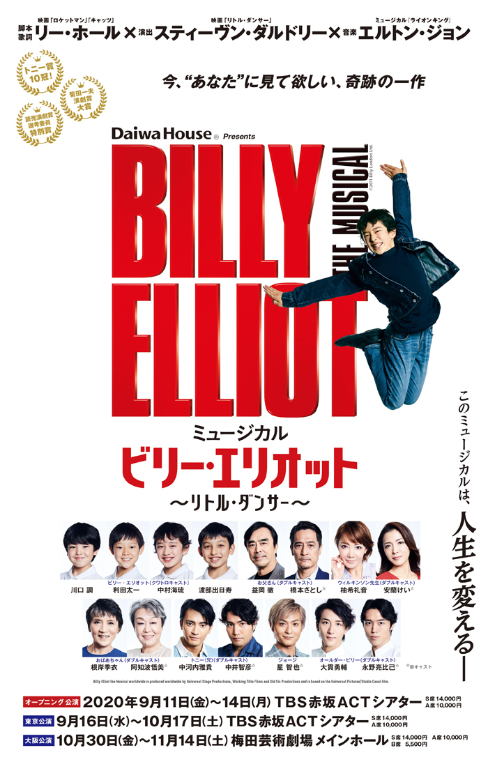 ※イープラス貸切公演11月3日(火祝)17:30の回のメインキャスト/子役キャストは、川口 調(ビリー)、橋本さとし(お父さん)、安蘭けい(ウィルキンソン先生)、阿知波悟美(おばあちゃん)、中河内雅貴(トニー)、大貫勇輔(オールダー・ビリー)/河井慈杏(マイケル)、森田瑞姫(デビー)、石井瑠音(トールボーイ)、大熊大貴(スモールボーイ)、チームアッシントン(バレエガールズ)となります。