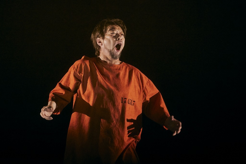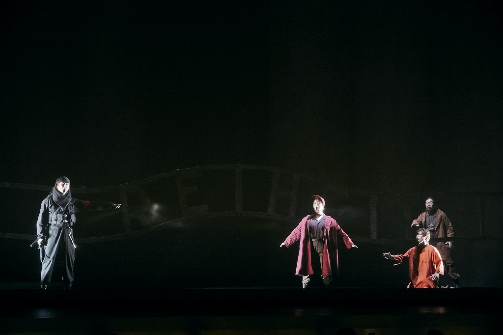 実際、序曲が鳴り出す前に、舞台上に映像とともに詩的な数行の詞が投影され、その内容によって、これから作品を見るにあたっての “前提条件” が提示される。まさしく、深作版『フィデリオ』のストーリーが、戦後75年における 「人間の自由への闘い」であることが明示されるのだ。