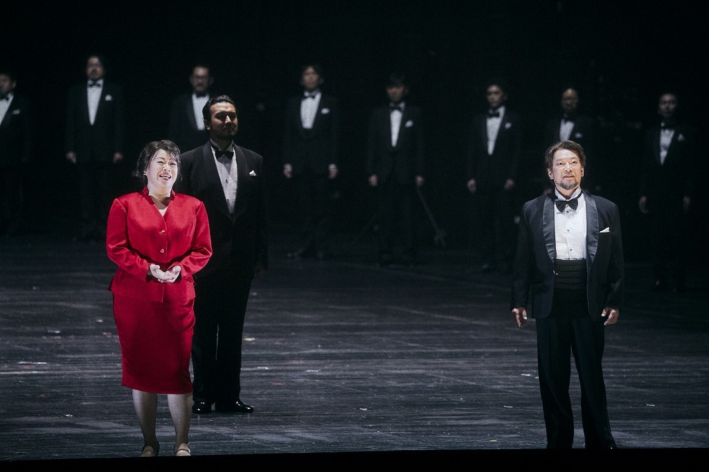 そして、見えないところで、最高の歌声を聴かせてくれた人々がいる。合唱団だ。残念ながら、舞台上で大勢を並ばせるわけにはいかず、当初予定していた合唱の人員配置だけは変更を余儀なくされたということだが、舞台裏であっても、迫力ある声が舞台の推進力を大いに高めていた。
