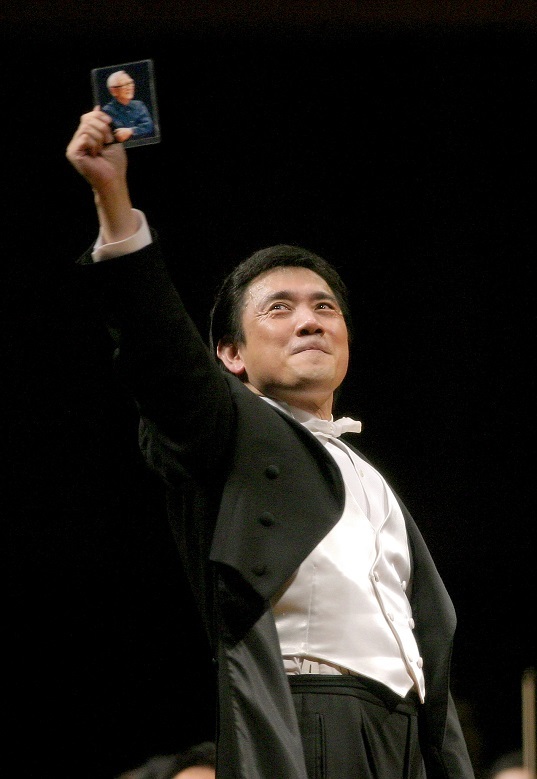 この写真は2004年7月9日のもの。この日と前日で大植さんが初めてブルックナー交響曲第8番を指揮する事で話題となった定期演奏会。7月9日は朝比奈さんの誕生日。大いに盛り上がったカーテンコール。これはきっと何かやるぞと、確信に近いものがありました。なので大植さんを狙っていました。何度か入退場を繰り返し、やおらポケットから朝比奈さんの写真、例の笑っている写真を高く掲げて、朝比奈さんに報告されているようでした。大植さんの誇らしげな表情が印象的でした。