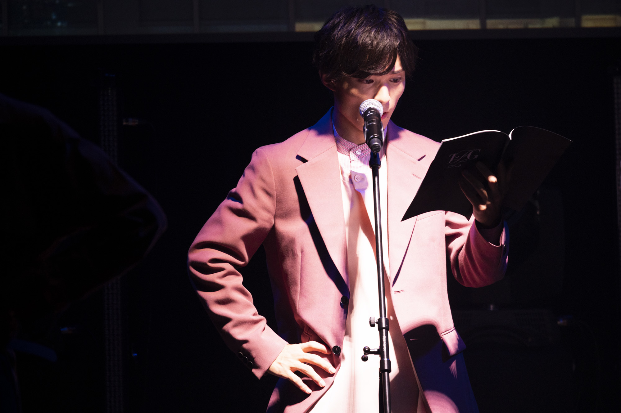 そして暗転。ピアノの旋律。スッとステージ上の空気が変わっていく。スタンドマイクの前に立つ7人。ここは、マンションTFG。一人きりの部屋でそれぞれがなにかを待つ時間をスケッチした、朗読劇が始まる。どこにでもいる等身大の青年の素直な声から伝わってくる、それぞれの日常の物語。役を纏っているようでもあり、素の自分を見せてくれているようでもあり。アーティストから俳優へ、瞬時にスイッチを切り替えながらも“届ける”気持ちは同じ。じっくりと彼らの声に耳を傾けるひとときも素敵だ。と、思っていると朗読のセリフにはいくつものキーワードが。その言葉がたどり着いたのは……次のナンバー「Celebration」。朗読から歌へとバトンが繋がれるおしゃれな展開に沿ってステージ全体をピンクのライトが包めば、響くはスパニッシュテイストのギターの音色。南国の夕暮れに吹き抜ける風をイメージさせる歌詞に合わせ、タオルを振って歌い踊る7人のユニゾンが優しく流れる。時刻もちょうど日没の頃。もし外でこの配信を観ていた人がいたなら、オレンジから紫に変わっていく空の様子も素敵な演出になっていただろう。